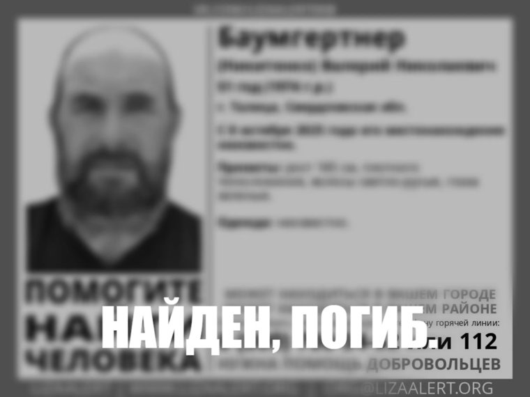 В районе Талицы (Свердловская область) 17 октября обнаружили мертвым 51-летнего Валерия Баумгертнера, без вести пропавшего на прошлой неделе. Об этом рассказали в поисково-спасательном отряде «ЛизаАлерт».