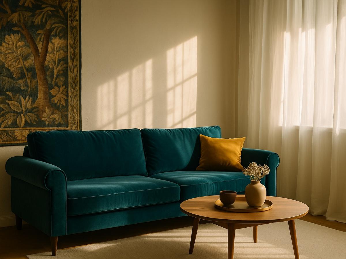 Бархат сразу задаёт атмосферу роскоши и глубины. Плотная ворсистая поверхность поглощает свет, образуя мягкие тени и "утяжеляя" предметы мебели. В интерьере бархат работает как фокусный материал — кресло, штора или диван из него всегда становятся центром внимания. Однако при избытке бархатных поверхностей помещение может казаться теснее, чем есть на самом деле.