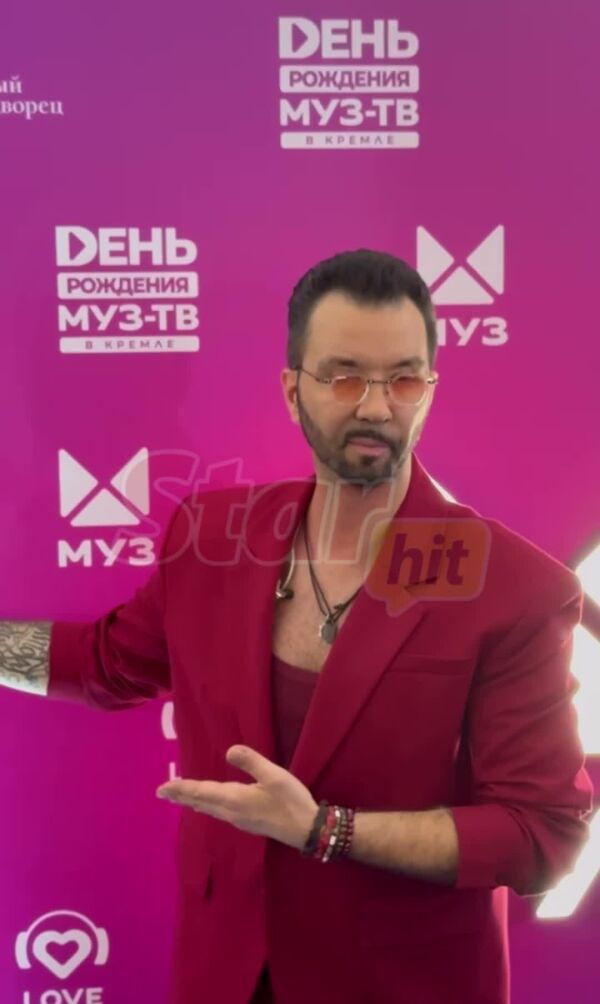 Денис Клявер появился на дорожке в Кремлевском дворце ярко-красном костюме. Музыкант некоторое время позировал перед фотографами и даже старался поймать рукой надпись «День рождения „МУЗ-ТВ“».