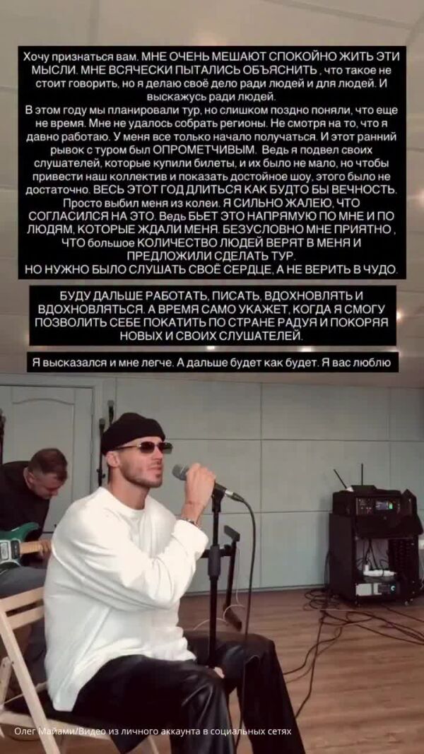 Выходные у Олега Майами точно не задались. Музыкант посетовал, что так и не смог провести тур и выступить в разных городах РФ. Сейчас певец огорчен тем фактом, что подвел фанатов, которые уже приобрели билеты на его выступления.