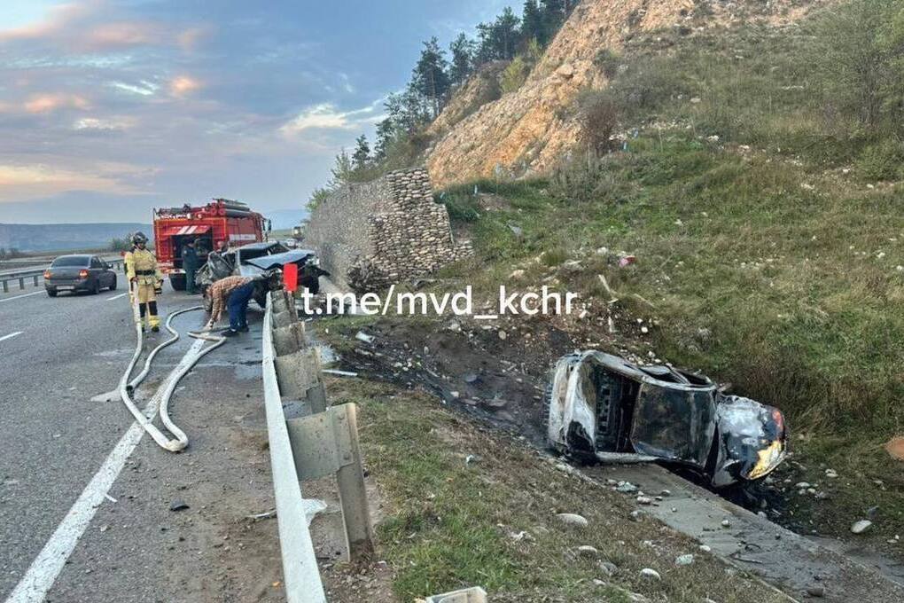 По предварительным данным, на 27 км дороги «Черкесск – Домбай», произошло попутное столкновение «Лады Веста» и «ВАЗ-2114», которыми управляли жители республики 21 и 22 лет. Затем «Веста» съехала в кювет и загорелась.