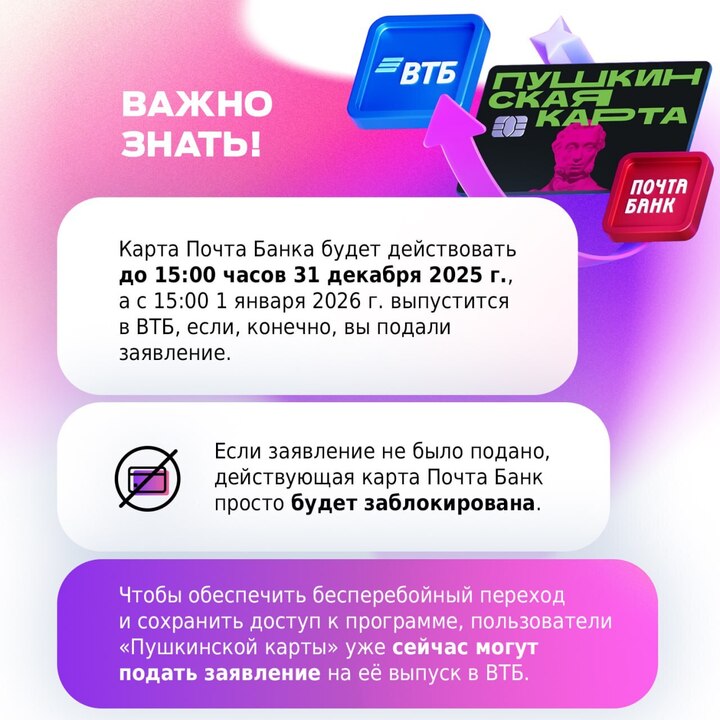 Напомним, что с 1 января 2026 года у «Пушкинской карты» сменится банк-оператор. Олег Николаев поручил проинформировать об этом родителей школьников и студентов. В госпабликах всех школ региона уже появилась пошаговая инструкция, как подать заявление на перевыпуск карты, и таким образом перейти и сохранить доступ к федеральной программе.