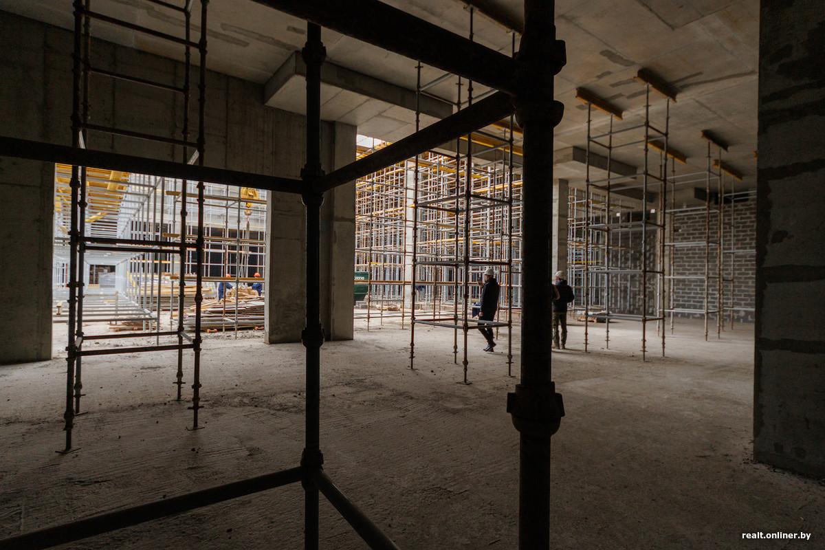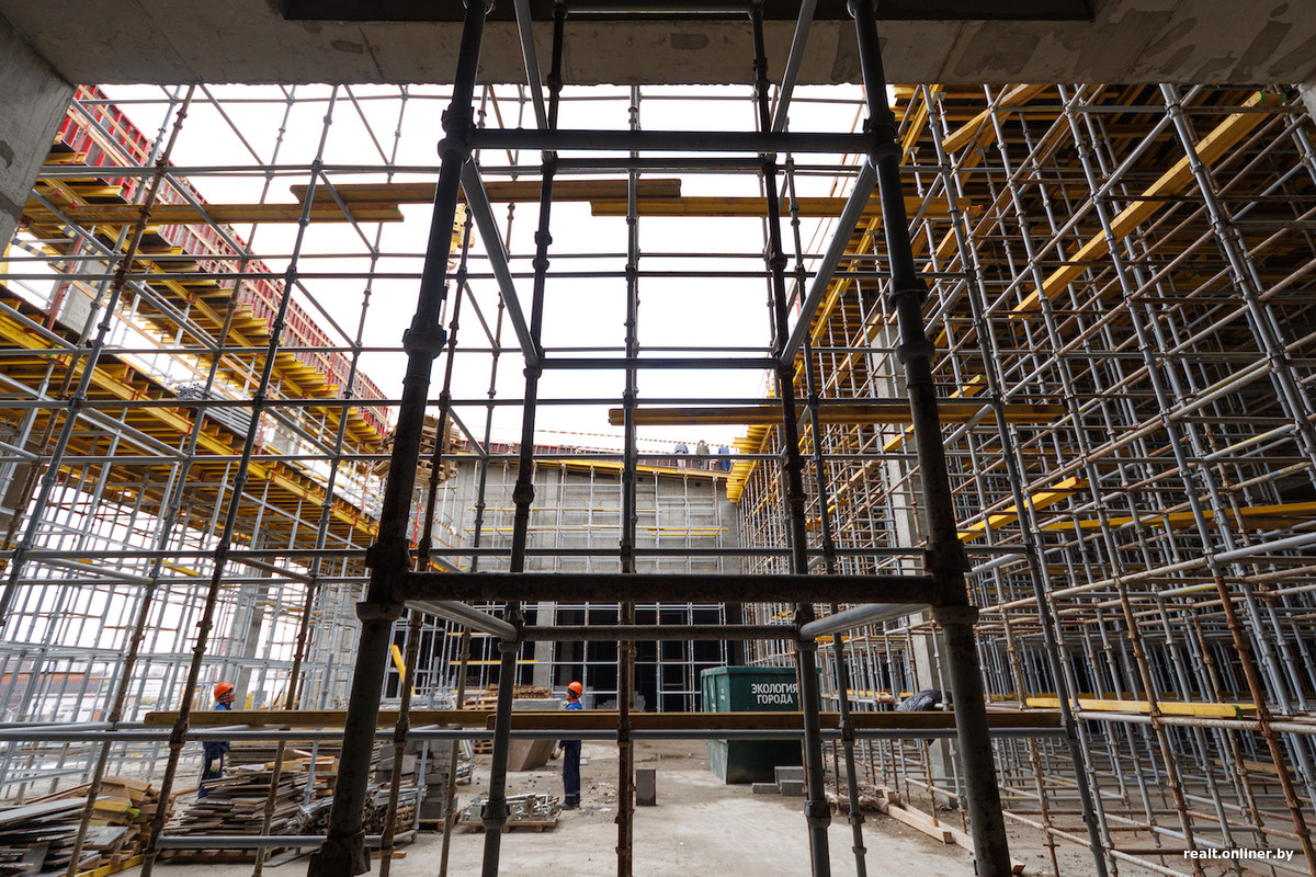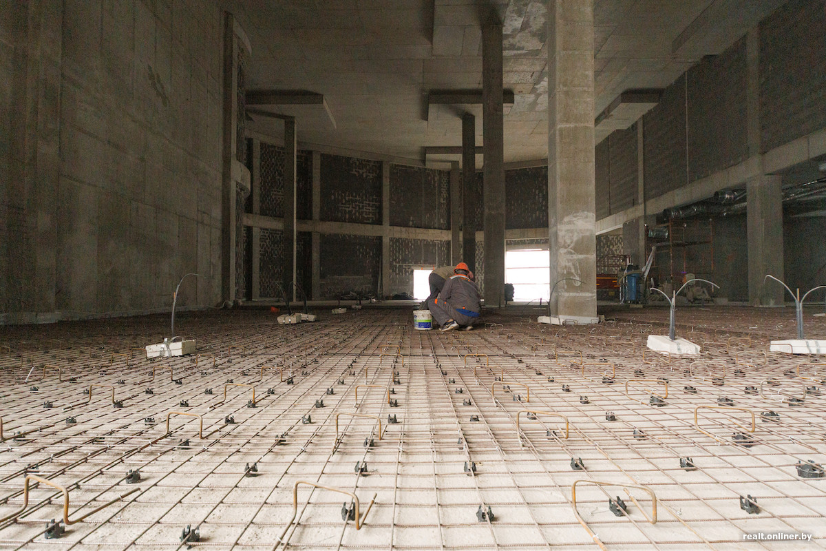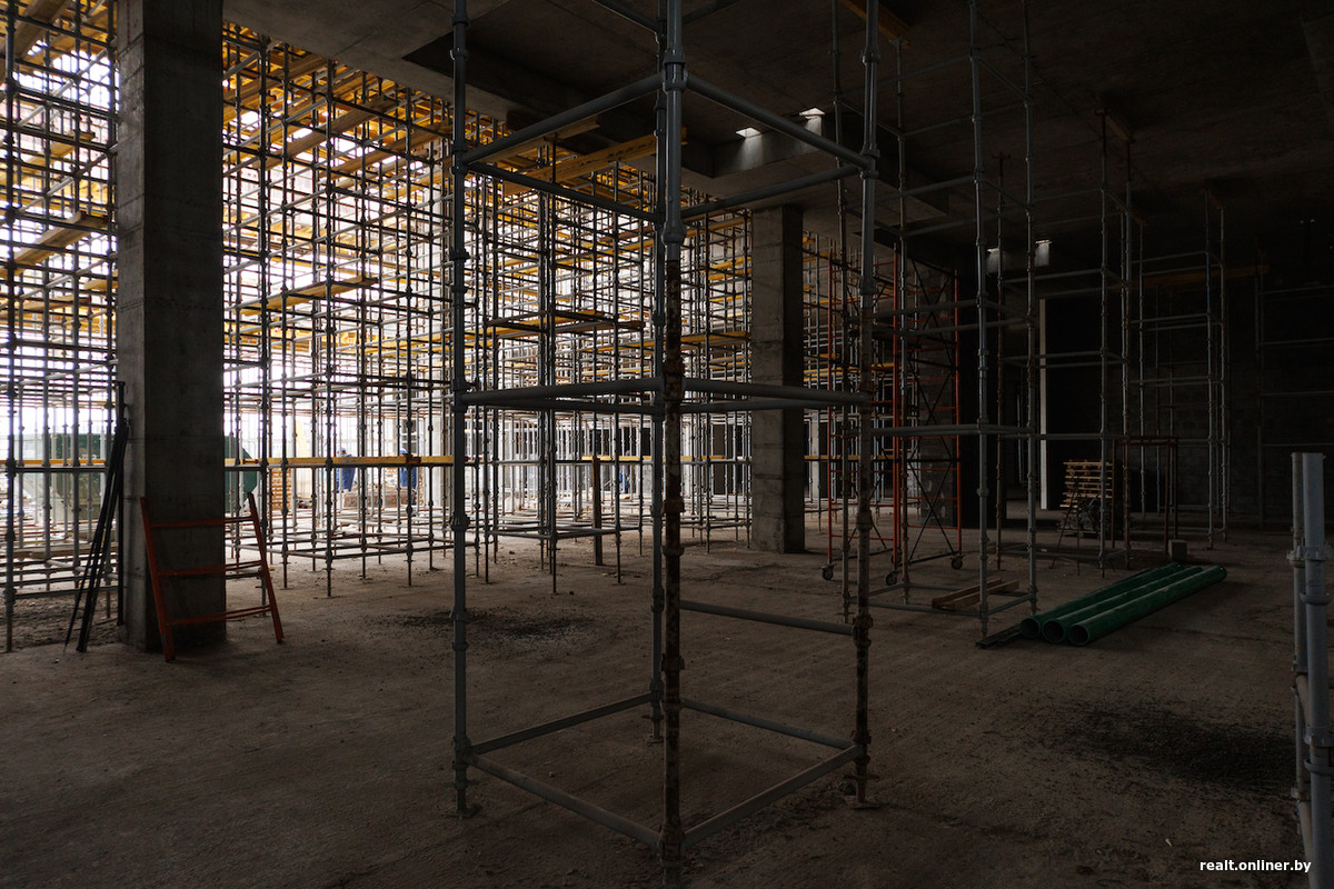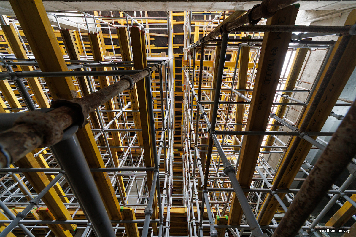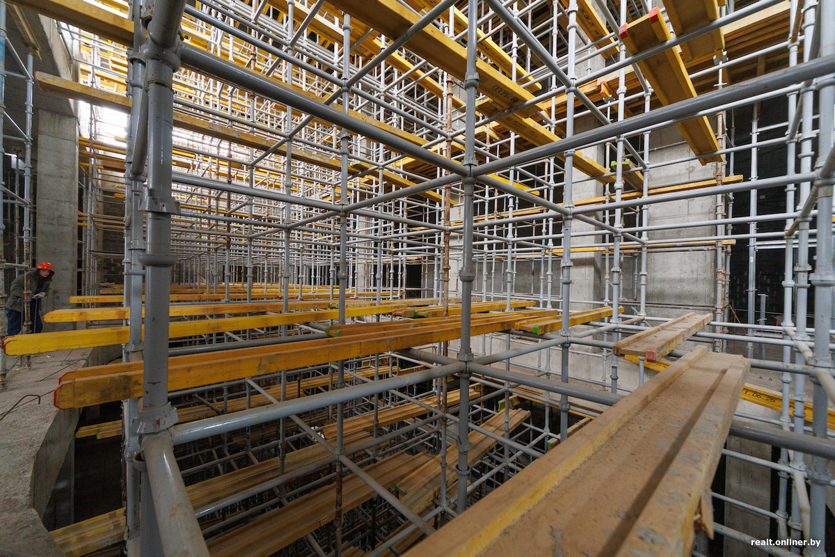 Остальные этажи заполнены если не людьми, то строительными лесами: густыми, но проходимыми — рабочие знают тропинки, связывающие одни уголки с другими. Обращает на себя внимание и будущий атриум.