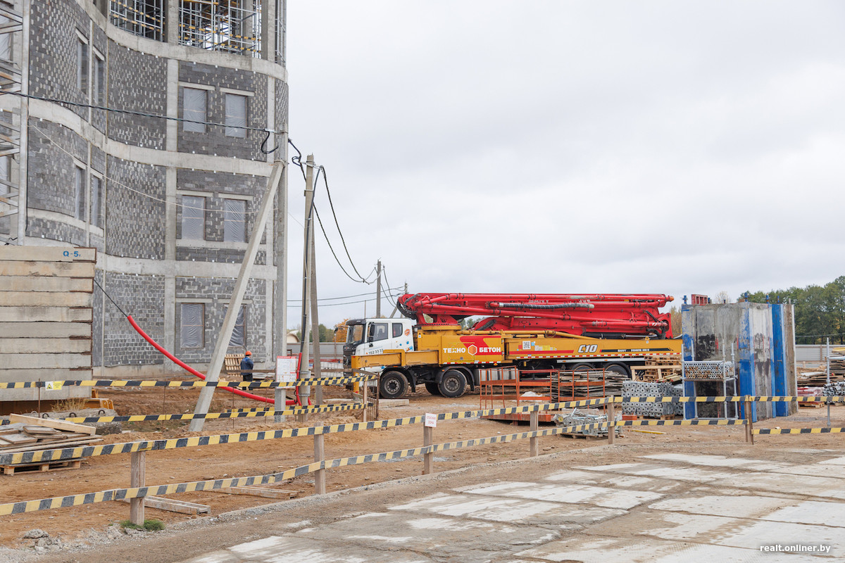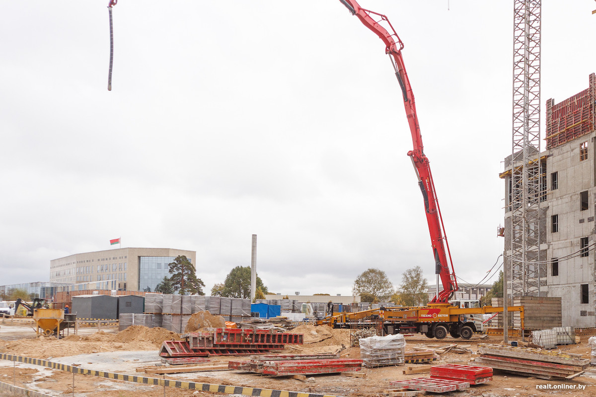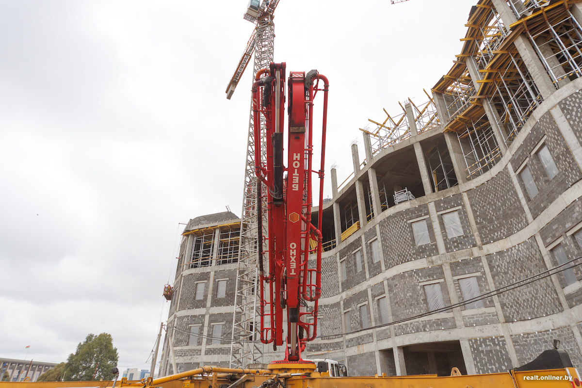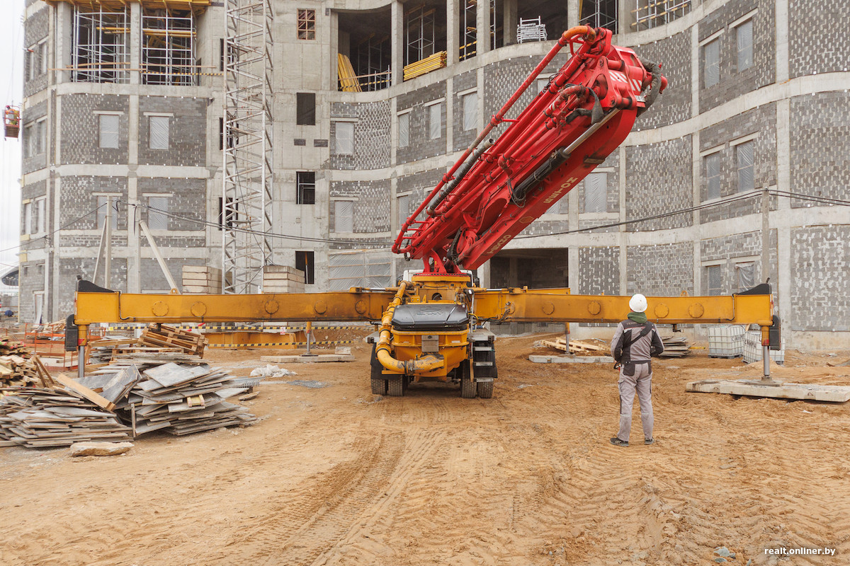 В отведенный для него час на «променад» из бетонных плит въезжает очередной гигант — бетононасос. Как раз для того, чтобы начать заливать плиту перекрытия пятого этажа. Участок, на который будет нацелен «щуп», даже не виден с земли: он где-то там, ближе к центру здания.