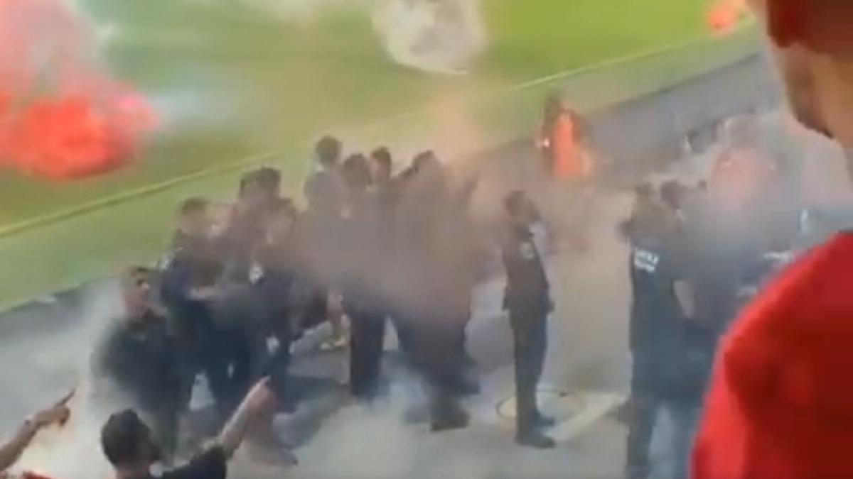 На кадрах видно, как футбольные фанаты обмениваются взаимными оскорблениями и пытаются затеять драку. Однако предотвратили серьезные последствия конфликта сотрудники полиции.