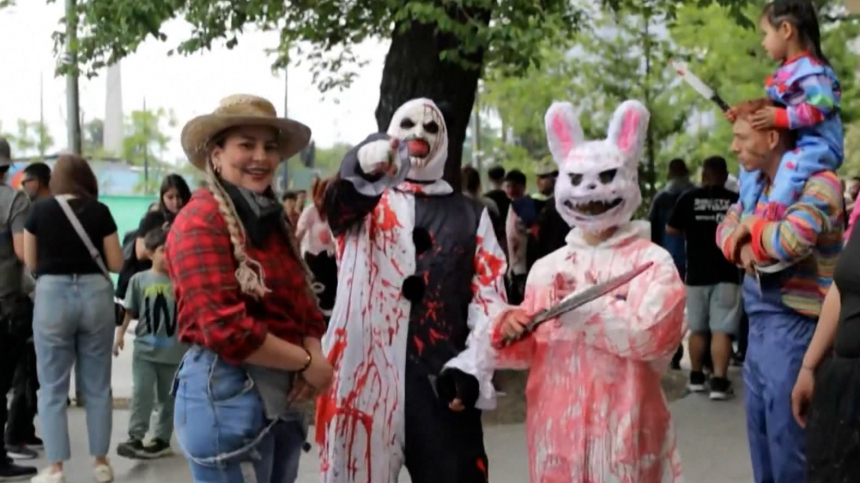 Массовое шествие зомби прошло в столице Чили в преддверии праздника Хэллоуин. Тысячи людей в образах разных персонажей и даже магических существ вышли на улицы города.