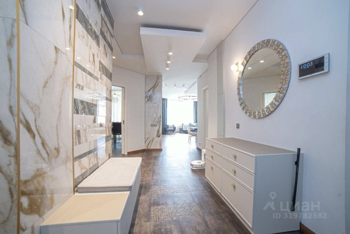 По словам продавца, планировка продумана до мелочей: просторная гостиная площадью 44,2 кв. м, кухня — 15,1 кв. м, кабинет — 19,8 кв. м, мастер-спальня с собственным санузлом и гардеробной — 43 кв. м. Также есть две детские комнаты (15 и 22,1 кв. м), каждая со своим санузлом, большая хозяйственная комната, отдельная гардеробная у входа и кладовая с доступом из подъезда.