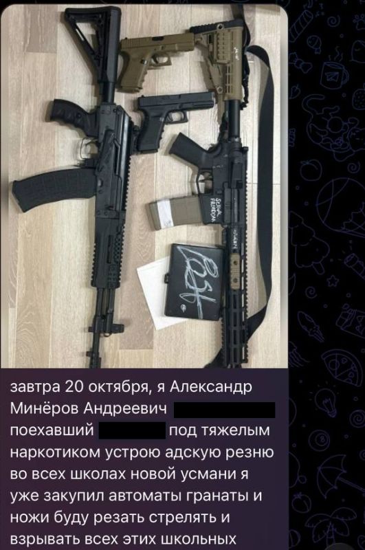 Согласно тексту публикаций некий Александр Минёров в довольно эмоционально негативной манере обещает устроить стрельбу и поножовщину в школах Новой Усмани. К своим сообщениям он прикрепляет фото со штурмовыми винтовками и пистолетами.
