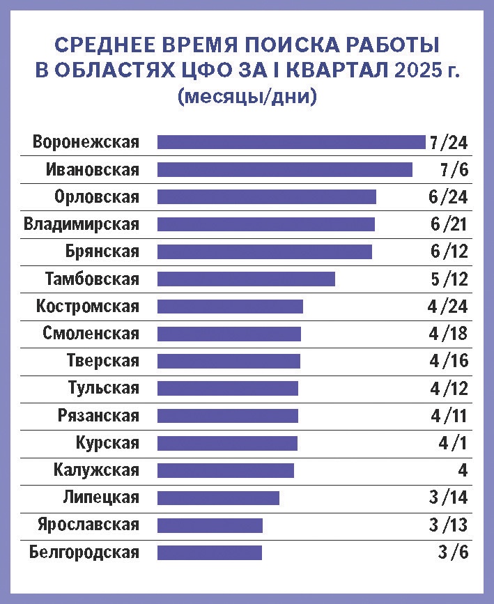 Больше полугода поиск работы занимает в Брянской, Владимирской, Орловской и Ивановской областях. От четырех до пяти с лишним месяцев - в Калужской, Курской, Рязанской, Тульской, Тверской, Смоленской, Костромской и Тамбовской.