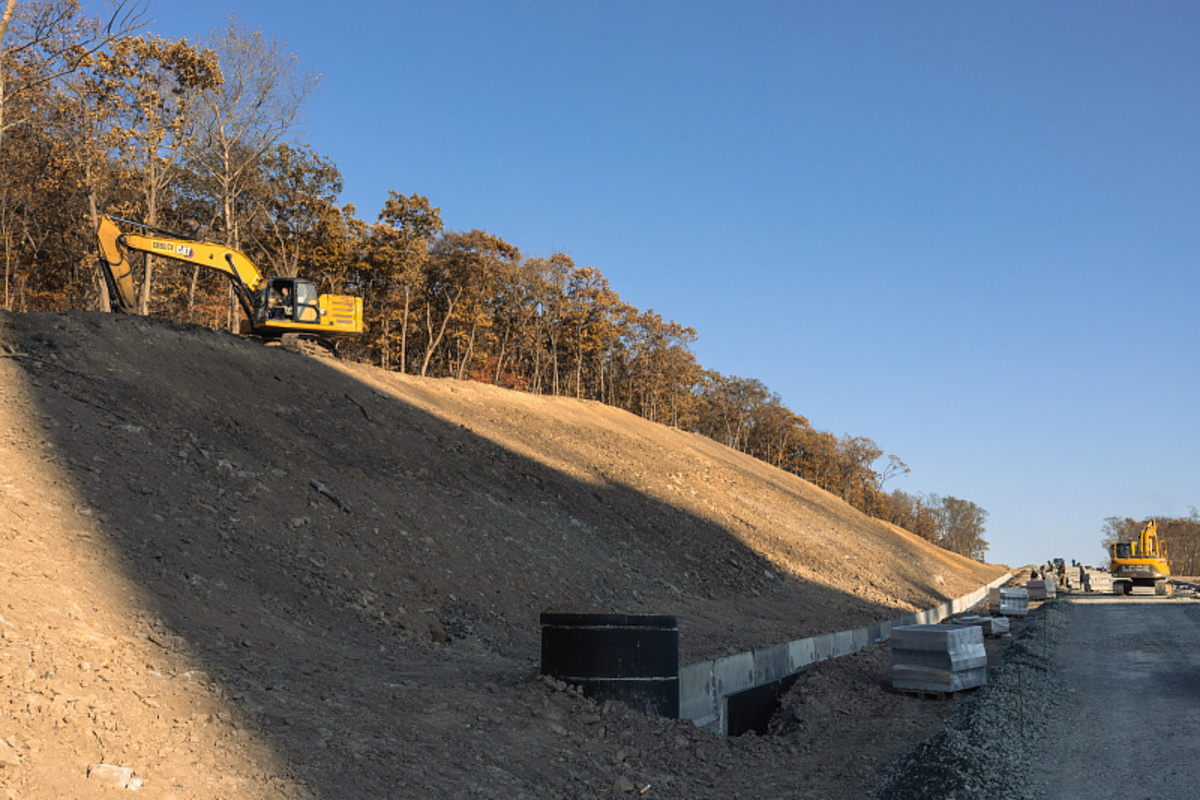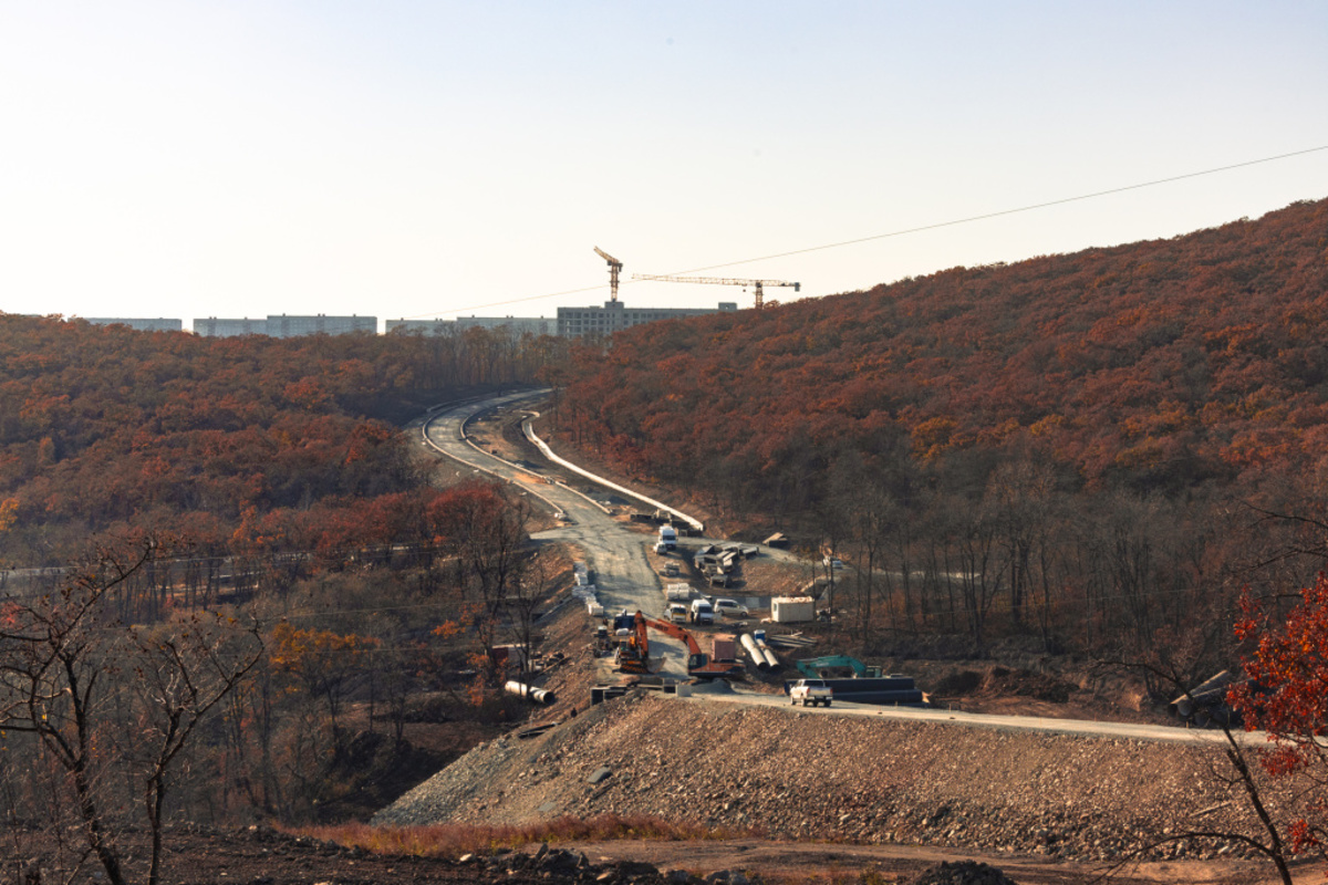 Как сообщает администрация Владивостока, стройка началась в прошлом году. За это время дорожники выполнили большой объём мероприятий: планировку территории, прокладку трассировки новой дороги и примыканий, устройство водоотведения, перенос сетей, монтаж защитных дорожных сооружений и подготовку основания дороги к асфальтированию.