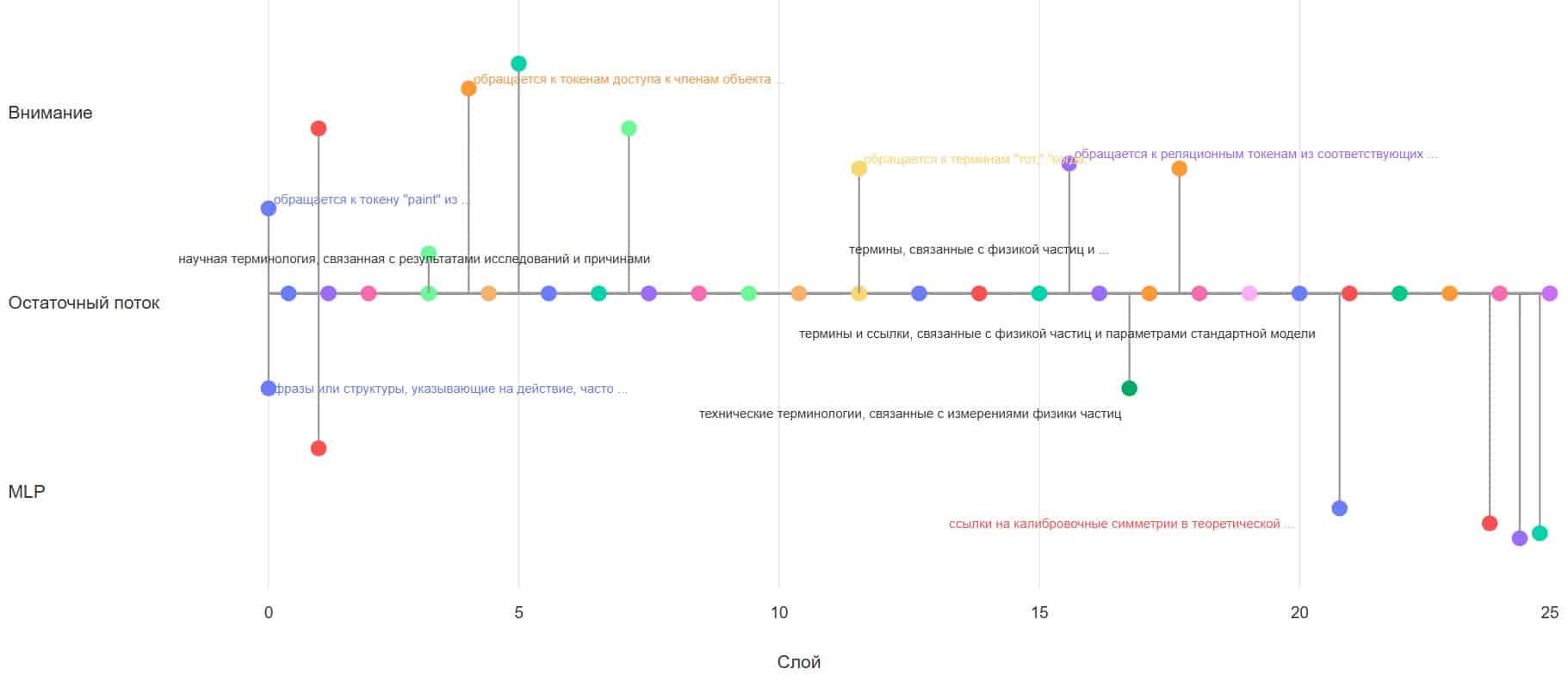 Механизм внимания. Этот граф потока, построенный с помощью нового метода, наглядно демонстрирует эволюцию одной-единственной концепции, связанной с научной физикой. Горизонтальная ось представляет собой глубину нейросети — от ранних слоев (слева) до финальных (справа). Каждая точка — это конкретное проявление этой концепции на определенном слое, а линии показывают ее «наследование». Видно, как на ранних этапах появляются общие научные термины, а по мере продвижения вглубь модели они уточняются и кристаллизуются в узкоспециализированные понятия, такие как «параметры стандартной модели» / © Daniil Laptev et al. / ICML 2025