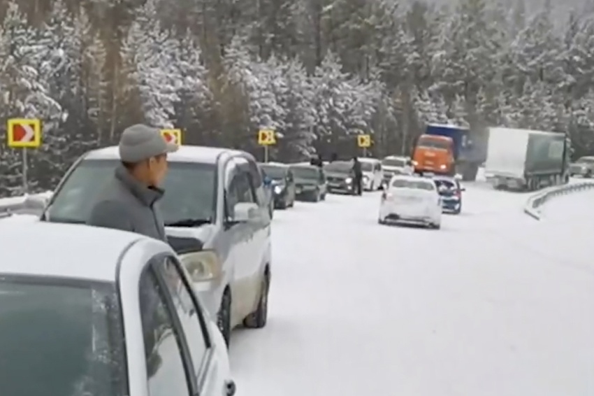 Затор на дороге образовался еще ночью из-за обильного снегопада. В результате 35 километров извилистой дороги между названными населенными пунктами стали непроходимыми.