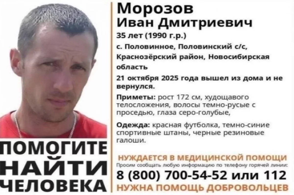 В Краснозерском районе продолжаются поиски Ивана Морозова, пропавшего 21 октября в селе Половинное. Уже шестой день спасатели и волонтеры пытаются установить местонахождение 35-летнего мужчины, который покинул свой дом в указанном населенном пункте и до настоящего времени не вернулся.