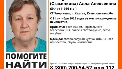 Волонтеры ПСО "ЛизаАлерт" сообщили, что в СТ Энергетик, город Калтан, пропала 69-летняя Петухова (Стасенкова) Алла Алексеевна. Местонахождение женщины остается неизвестным с 21 октября.