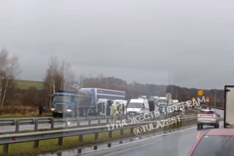 Фура с щебнем опрокинулась на бок на мосту через реку Упа в Ленинском районе Тульской области. ДТП произошло сегодня днем, 31 октября.