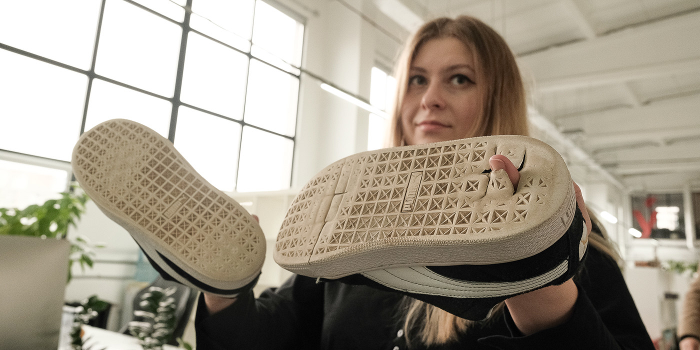 Мы решили узнать, возможно ли вообще восстановить пару этих б/у кроссовок до состояния свежих и новых. На рынке есть разные организации, которые вместе с химчисткой обуви предлагают услуги по реставрации. Иногда для оценки фронта работ достаточно отправить фото повреждений, но у нас случай нетипичный — отправляемся в одну из сетевых ремонтных мастерских, которые специализируются именно на кроссовках. А пока тест для вашей интуиции: в какую сумму там оценили работу с нашей обувью?