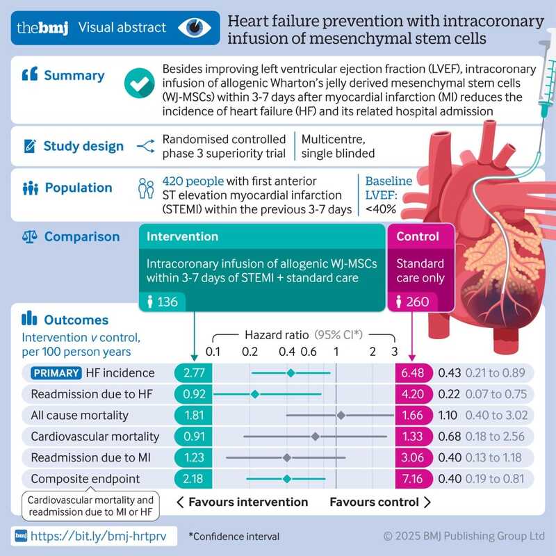 Внутрикоронарное введение WJ-MSC снизило частоту развития сердечной недостаточности (2,77 против 6,48 на 100 человеко-лет), повторных госпитализаций с сердечной недостаточностью (0,92 против 4,20 на 100 человеко-лет). Также отмечено улучшение по комбинированной конечной точке, включающей сердечно-сосудистую смертность и частоту повторных госпитализаций по поводу инфаркта миокарда или развития сердечной недостаточности (2,80 против 7,16 на 100 человеко-лет). В то же время не было продемонстрировано статистически значимого влияния на частоту повторных госпитализаций по причине инфаркта, смертность от всех причин или смертность от сердечно-сосудистых заболеваний. Фракция выброса левого желудочка, которую наблюдали в течение шести месяцев, увеличилась в обеих группах, однако в группе вмешательства увеличение было значительно более выраженным.
