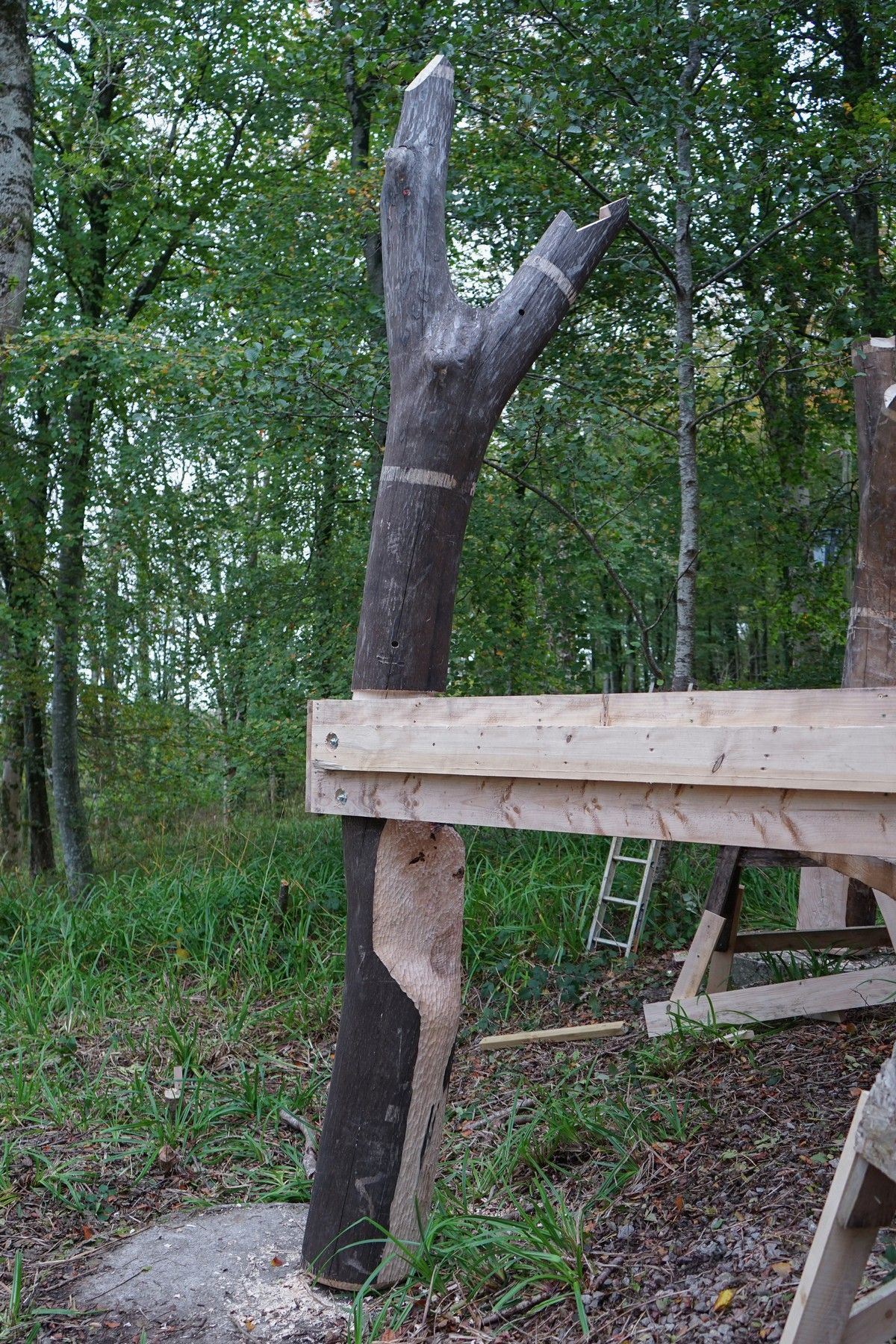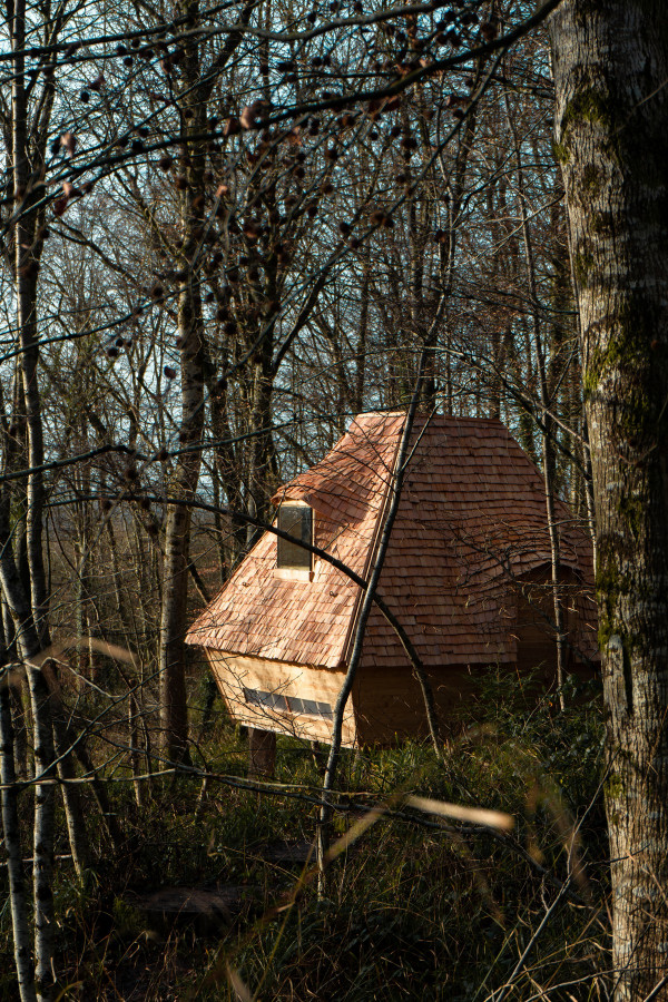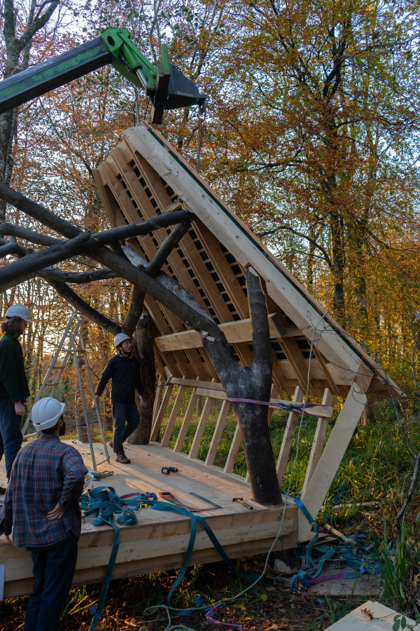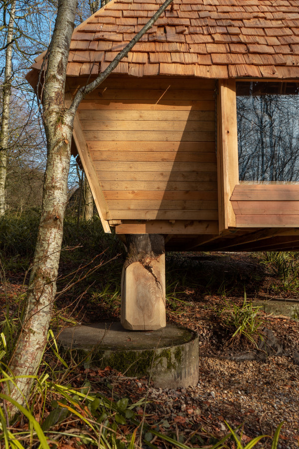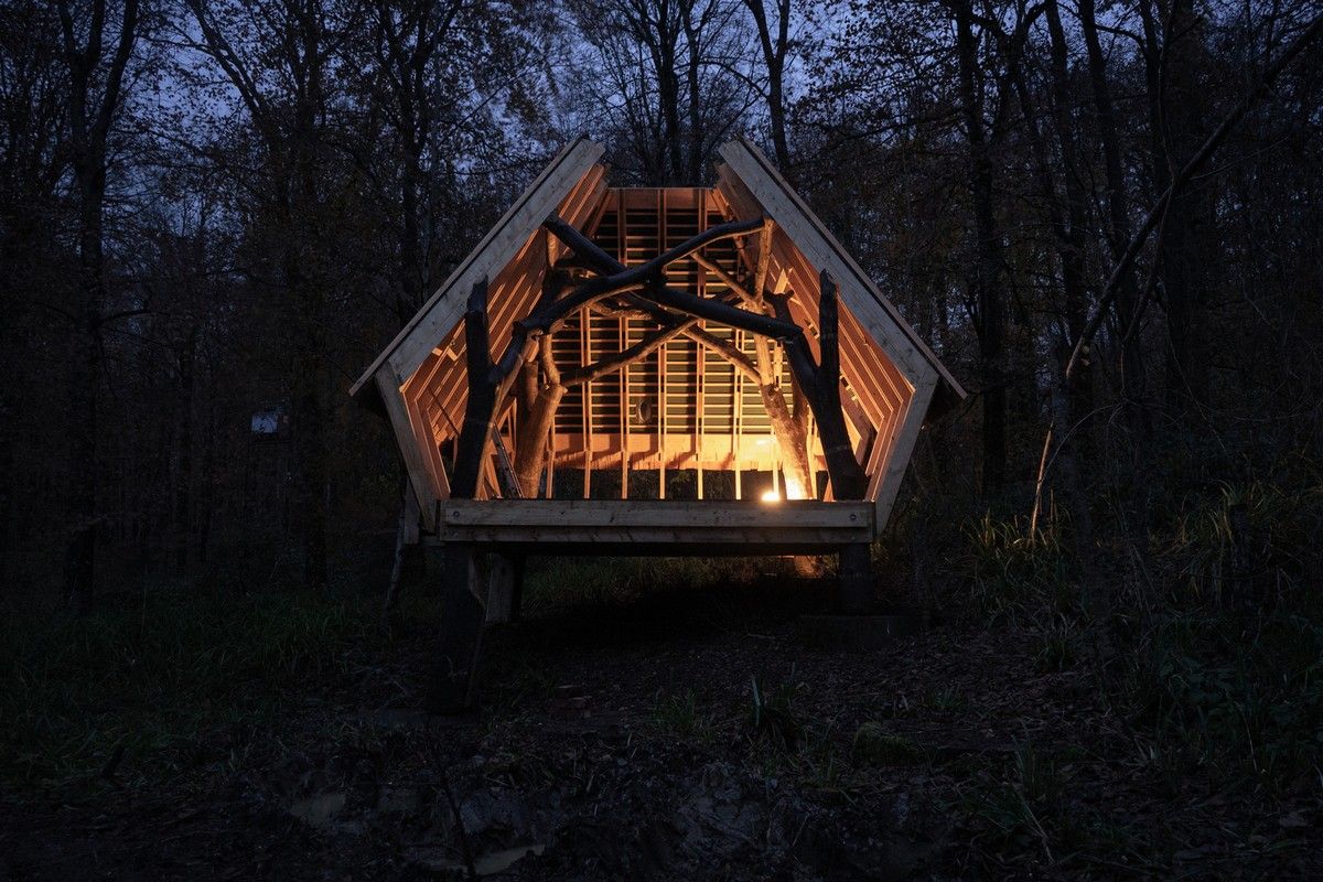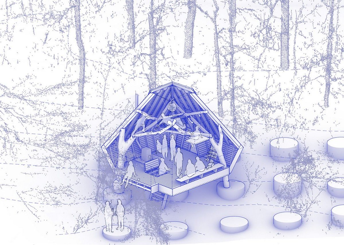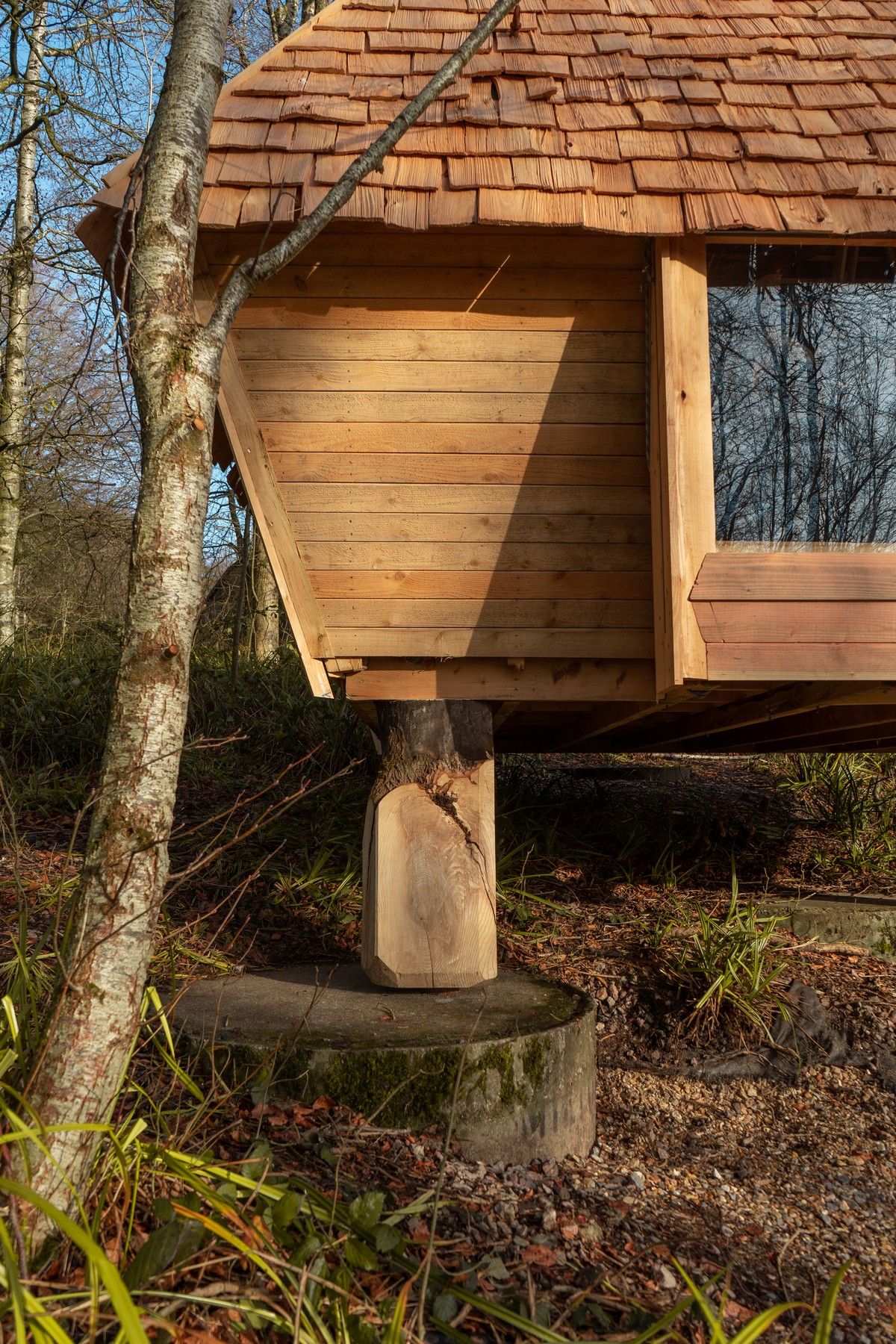 Первичная конструкция опирается на четыре бетонных фундамента. Конструкция состоит из ветвей деревьев разного размера, расположенных в виде четырех колонн, соединенных элементом распорки. Для учета геометрии дерева как основного звена конструкции были использованы роботизированные технологии. Пять окон являются не только источником света, но обеспечивают многослойное расположение в пространстве, позволяющие расширить вид на внешний ландшафт.Сдержанный экстерьер скрывает тщательно продуманный интерьер. Открывая складную дверь попадаешь в помещение, залитое естественным светом сверху. Сетка, подвешенная над головой, и мансардное окно привлекают посетителя найти способы получить к ним доступ. Далее большое панорамное окно переносит взгляд на лесной массив. Ряд стволов деревьев выступает из пола и разветвляется внутрь, образуя крону ветвей, которые цепляются за крышу. Элементы мебели обеспечивают ступеньку в ветвях, позволяя подняться в пространства, которые могут быть как уединенными, так и социальными.Архитектура данного проекта уникальна, в нем были использованы современные методы плотницких работ для создания ряда соединений между деревом, а также строение по необходимости можно перемещать.