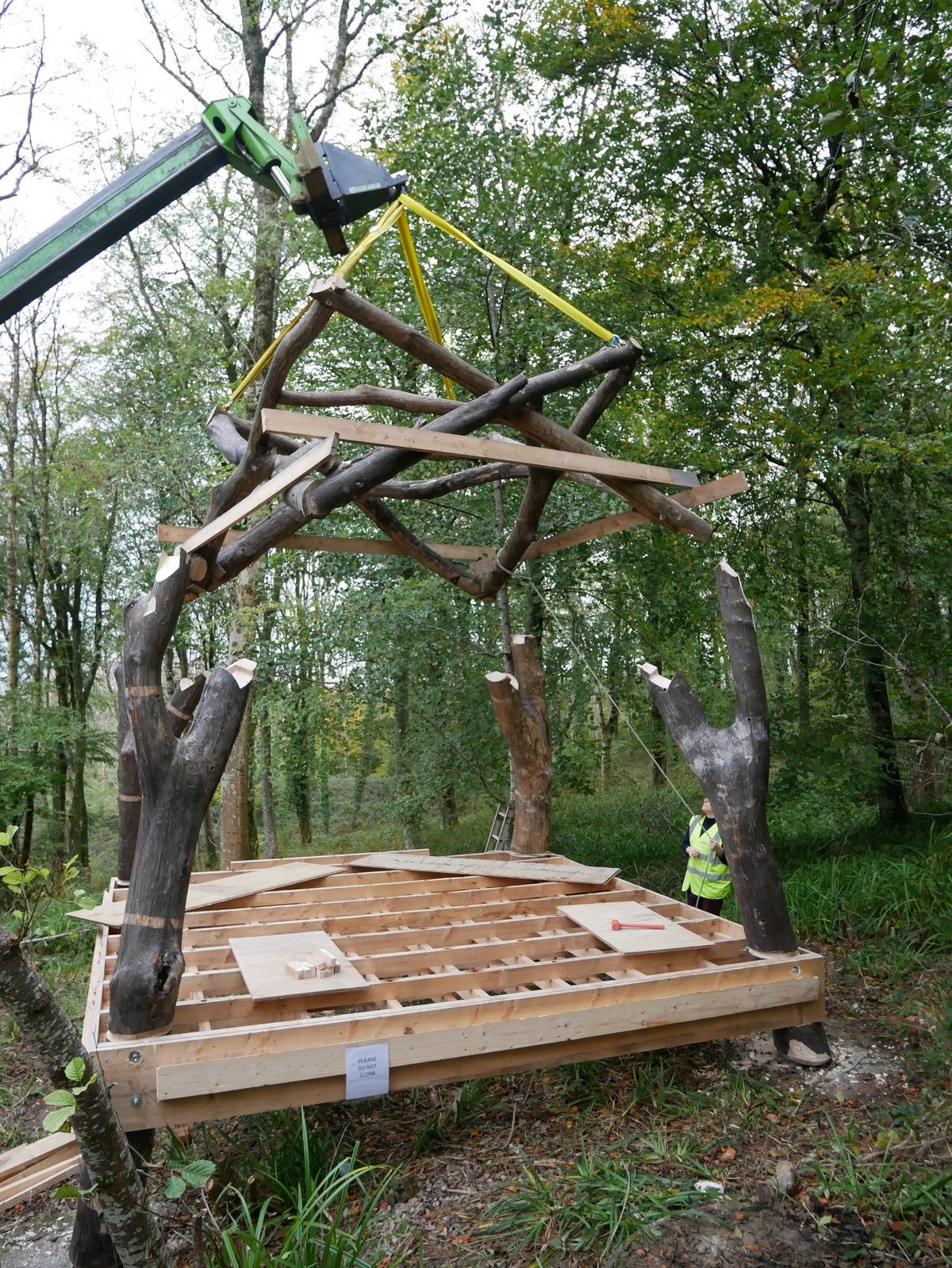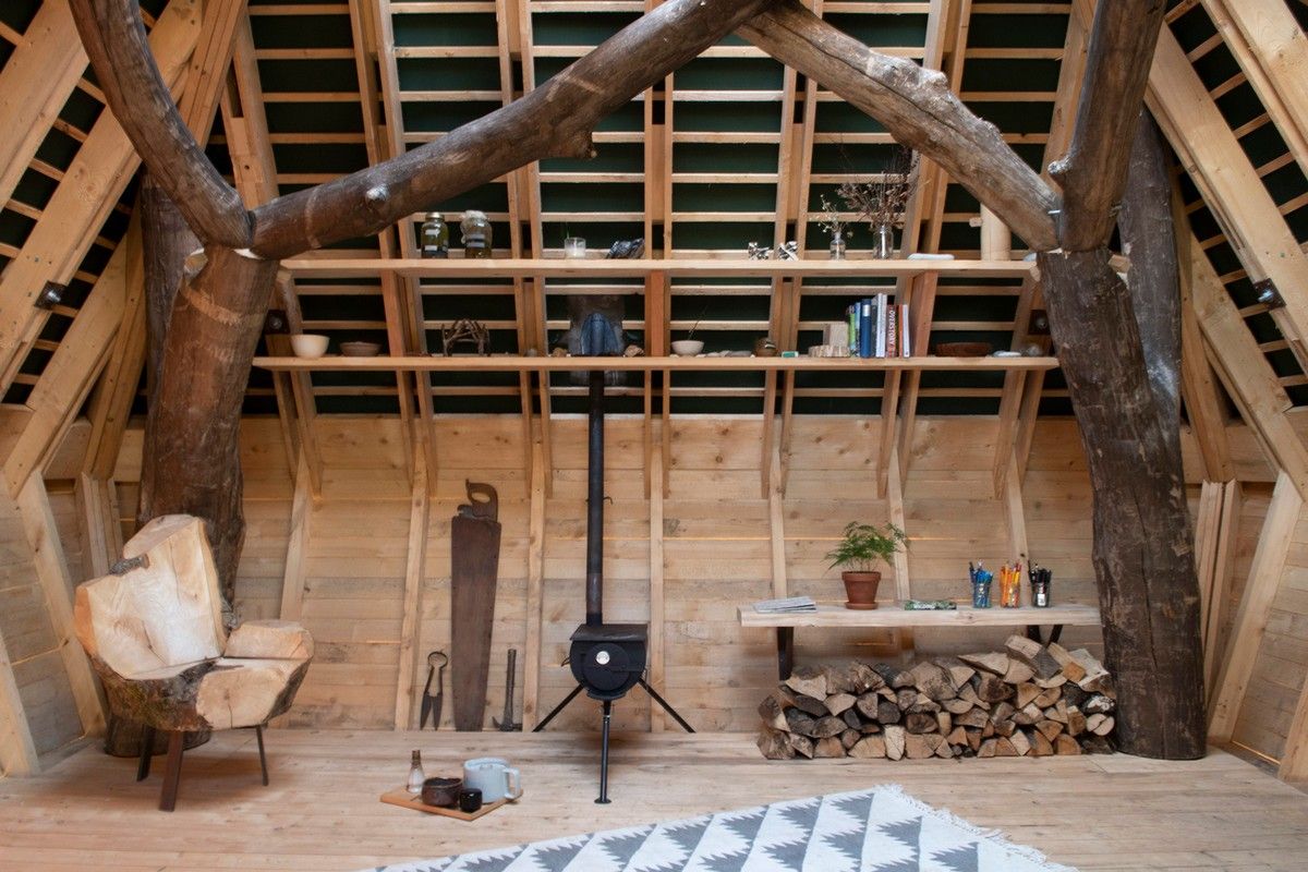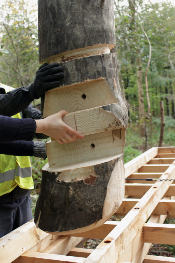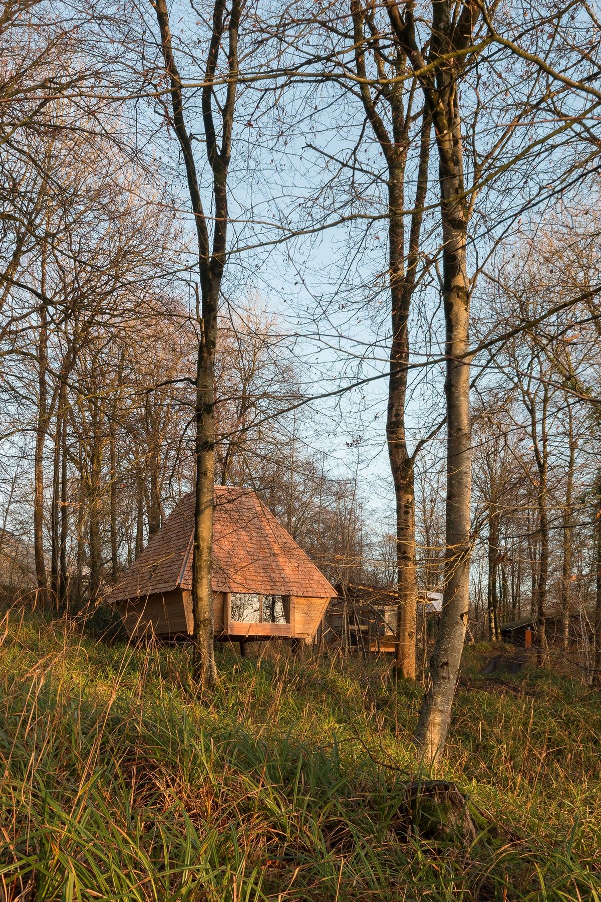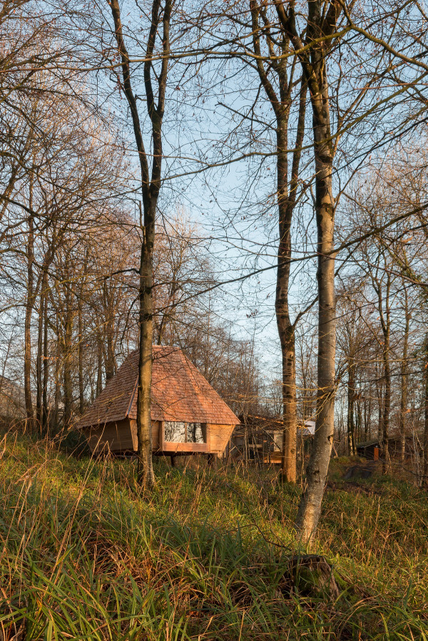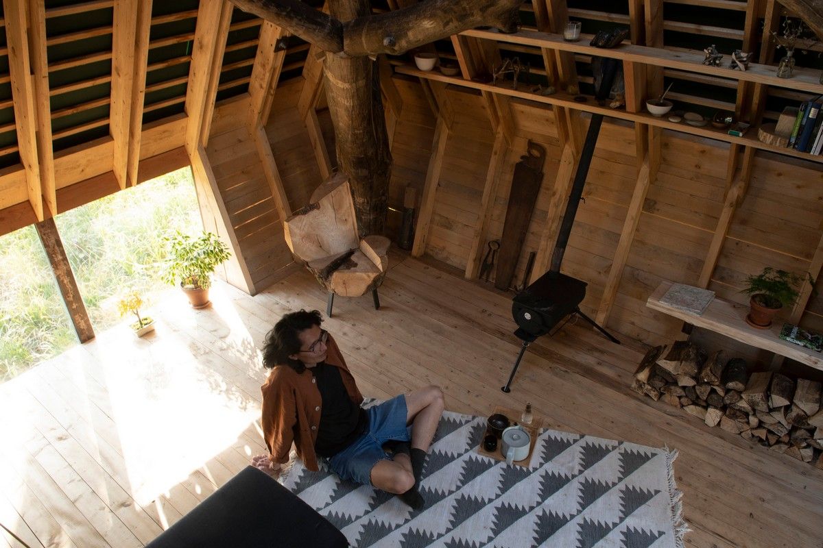 Первичная конструкция опирается на четыре бетонных фундамента. Конструкция состоит из ветвей деревьев разного размера, расположенных в виде четырех колонн, соединенных элементом распорки. Для учета геометрии дерева как основного звена конструкции были использованы роботизированные технологии. Пять окон являются не только источником света, но обеспечивают многослойное расположение в пространстве, позволяющие расширить вид на внешний ландшафт.Сдержанный экстерьер скрывает тщательно продуманный интерьер. Открывая складную дверь попадаешь в помещение, залитое естественным светом сверху. Сетка, подвешенная над головой, и мансардное окно привлекают посетителя найти способы получить к ним доступ. Далее большое панорамное окно переносит взгляд на лесной массив. Ряд стволов деревьев выступает из пола и разветвляется внутрь, образуя крону ветвей, которые цепляются за крышу. Элементы мебели обеспечивают ступеньку в ветвях, позволяя подняться в пространства, которые могут быть как уединенными, так и социальными.Архитектура данного проекта уникальна, в нем были использованы современные методы плотницких работ для создания ряда соединений между деревом, а также строение по необходимости можно перемещать.