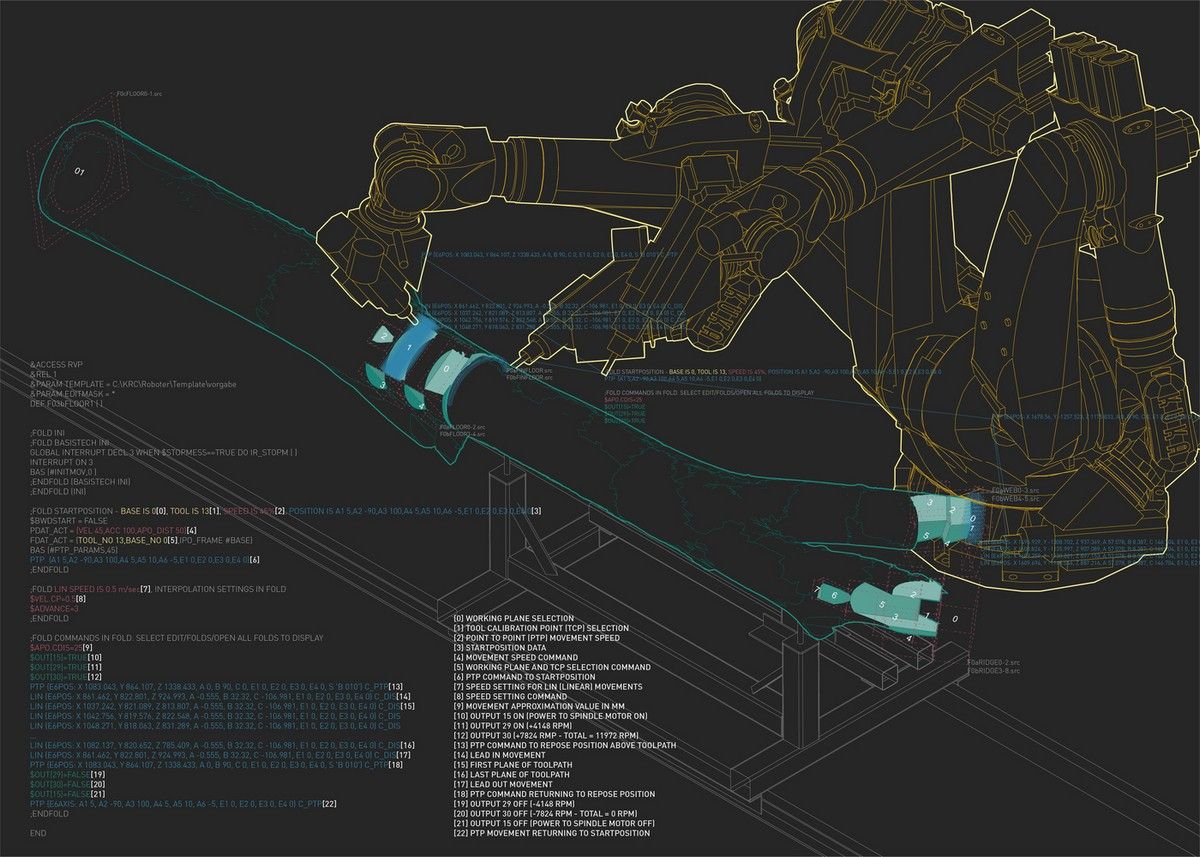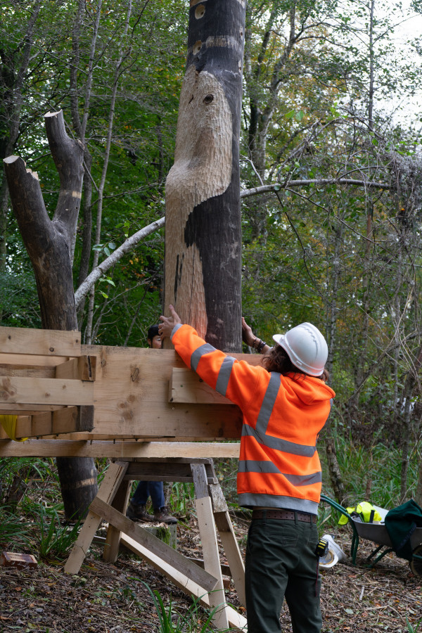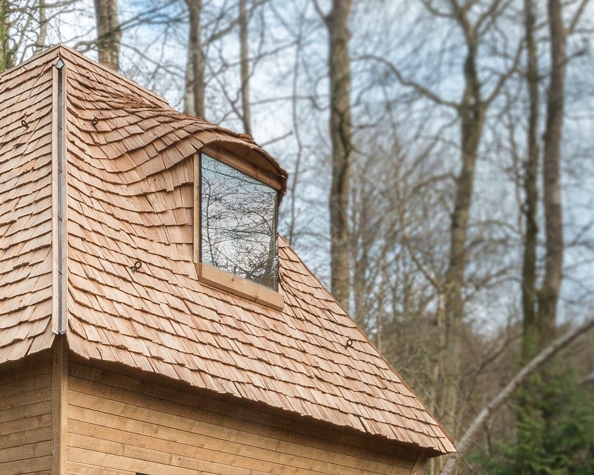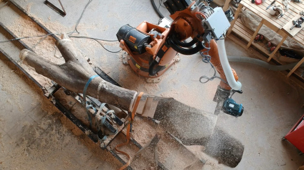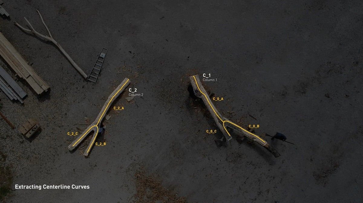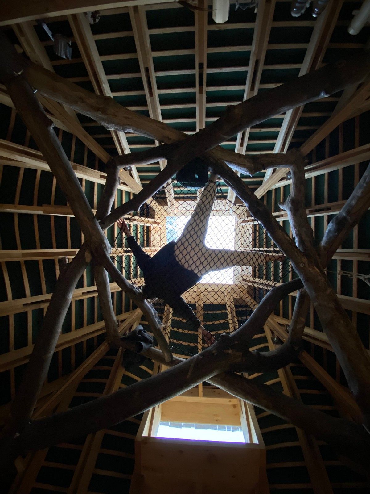 Первичная конструкция опирается на четыре бетонных фундамента. Конструкция состоит из ветвей деревьев разного размера, расположенных в виде четырех колонн, соединенных элементом распорки. Для учета геометрии дерева как основного звена конструкции были использованы роботизированные технологии. Пять окон являются не только источником света, но обеспечивают многослойное расположение в пространстве, позволяющие расширить вид на внешний ландшафт.Сдержанный экстерьер скрывает тщательно продуманный интерьер. Открывая складную дверь попадаешь в помещение, залитое естественным светом сверху. Сетка, подвешенная над головой, и мансардное окно привлекают посетителя найти способы получить к ним доступ. Далее большое панорамное окно переносит взгляд на лесной массив. Ряд стволов деревьев выступает из пола и разветвляется внутрь, образуя крону ветвей, которые цепляются за крышу. Элементы мебели обеспечивают ступеньку в ветвях, позволяя подняться в пространства, которые могут быть как уединенными, так и социальными.Архитектура данного проекта уникальна, в нем были использованы современные методы плотницких работ для создания ряда соединений между деревом, а также строение по необходимости можно перемещать.