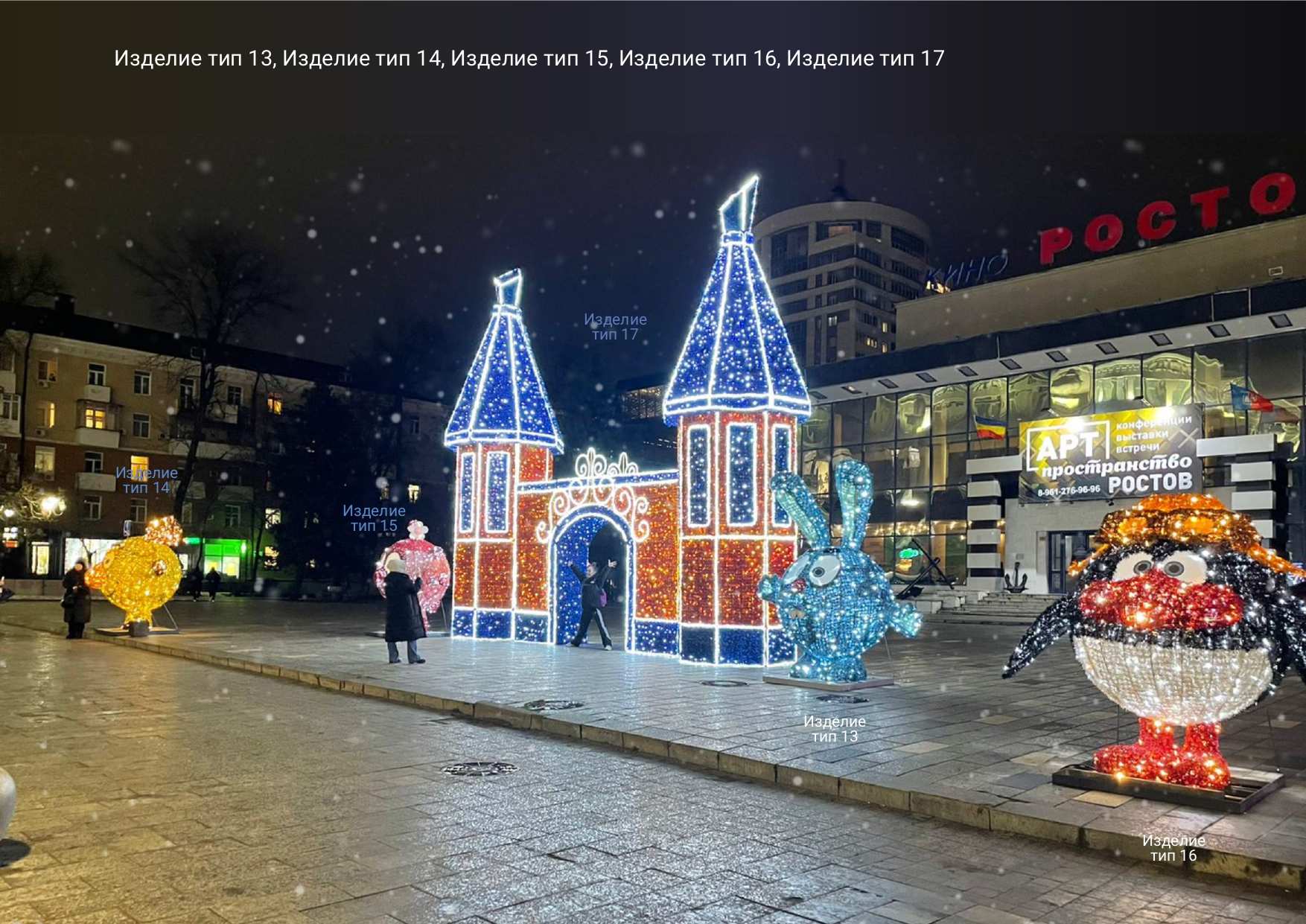В рамках работ подрядчику предстоит обеспечить доставку световых элементов со склада, их монтаж и последующую эксплуатацию. Среди известных локаций, где будут установлены украшения, — площадь перед бывшим кинотеатром «Ростов» на Университетском, где вновь появятся фигуры героев мультфильма «Смешарики». Также на пересечении улиц Театральной и Большой Садовой вновь установят светящуюся композицию в форме сердца с надписью «Любимый город».