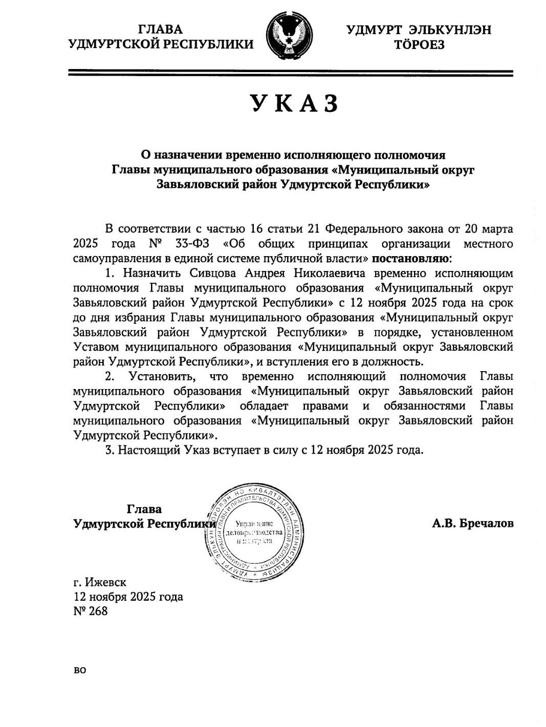 Согласно документу, временно исполнять обязанности главы муниципалитета Андрей Сивцов начал со среды, 12 ноября. Руководить Завьяловским районом он будет до дня избрания нового главы муниципального образования.