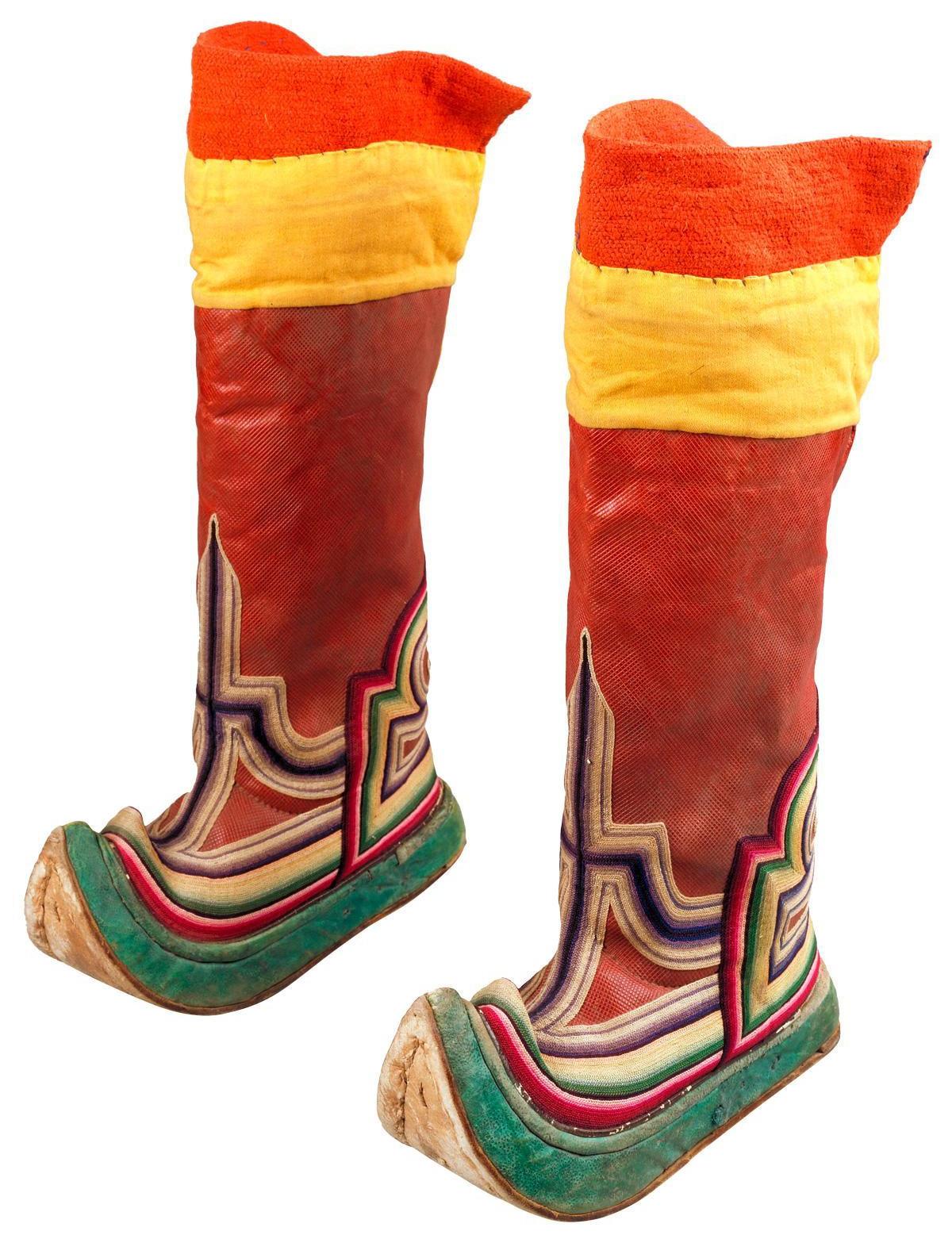 Тибетские сапоги сделаны из кожи яка, вышиты шерстью или шелком. Грубая подошва хорошо защищает ступни на неровной местности. Часто утеплены мехом.