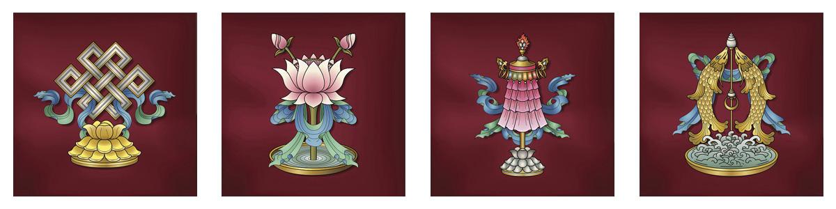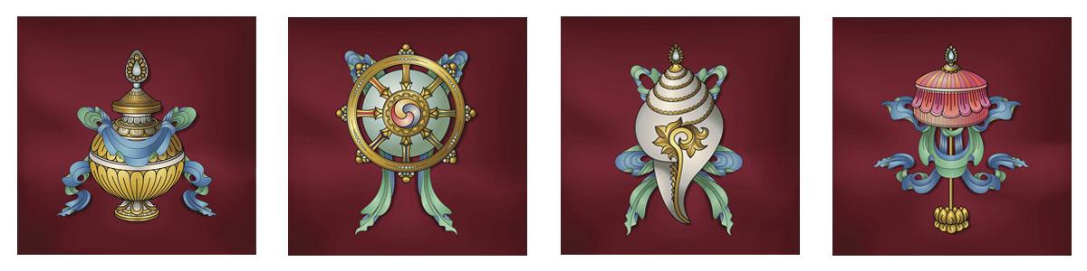 7. Раковина — означает голос дхармы (учения Будды), распространяющий мудрость. Используется в церемониальных костюмах монахов.