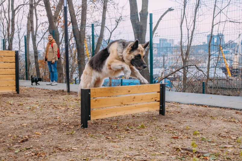 Зонирование таково: половина площади — для активных игр, еще 20-30 процентов — зона для дрессировки с оборудованием, а именно — наклонными трапами, барьерами для перешагивания или перепрыгивания, мостиками, качающимися поверхностями, тоннелями, лестницами и их сочетаниями. Зона для владельцев — не меньше десяти процентов площади, требования — навес, скамьи, урна.
