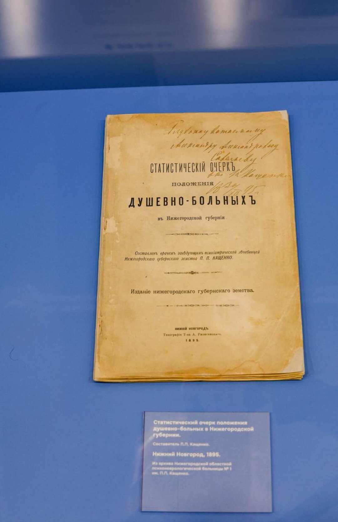 В рамках проекта Нижегородский клинический центр психического здоровья им. Кащенко передал музею статистический очерк положения душевнобольных в Нижегородской губернии 1895 года с дарственной подписью Петра Кащенко. Уникальный экспонат содержит подробную статистику по душевным заболеваниям в губернии и размышления автора о природе психических расстройств (кстати, вот здесь можно найти оцифрованную версию).