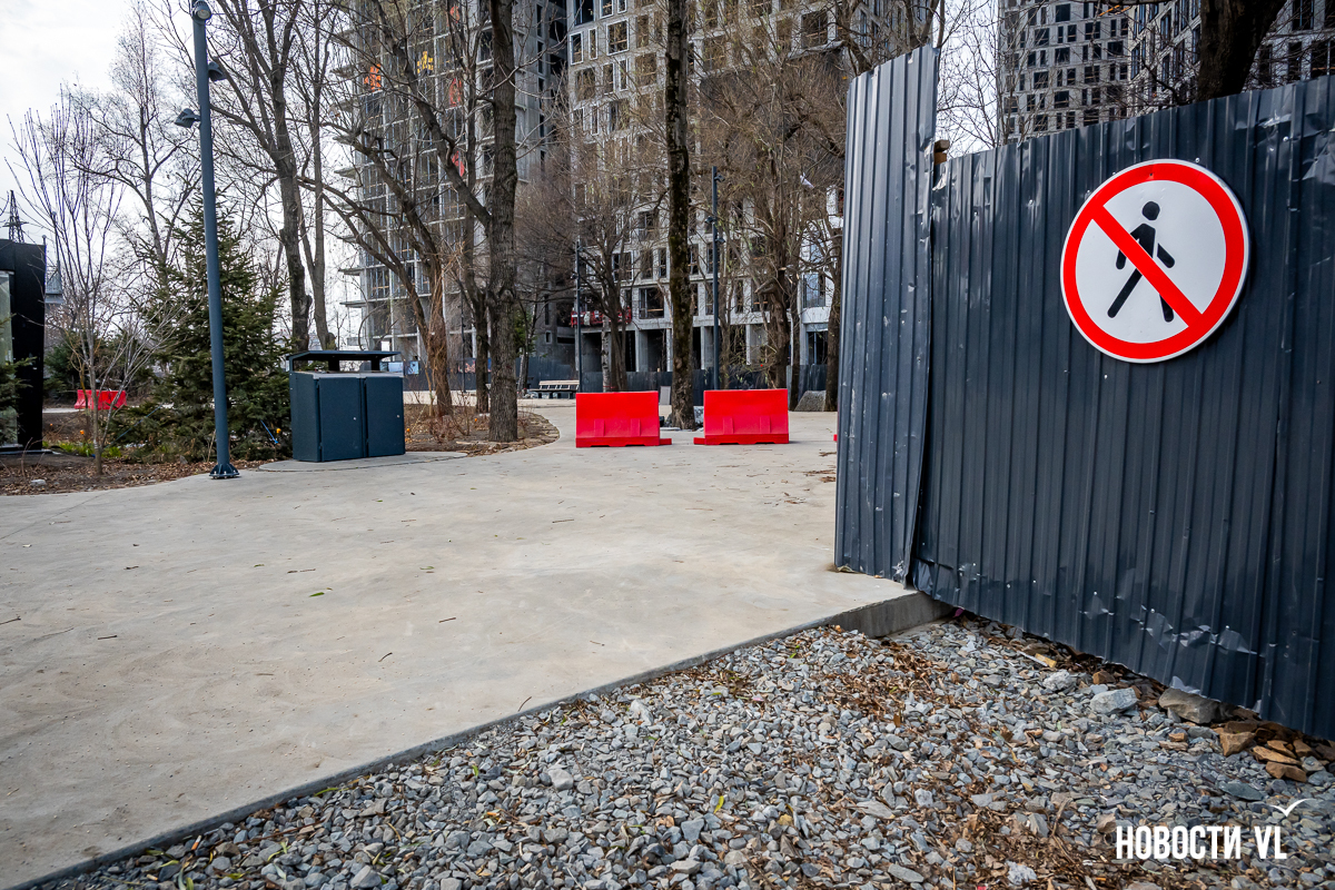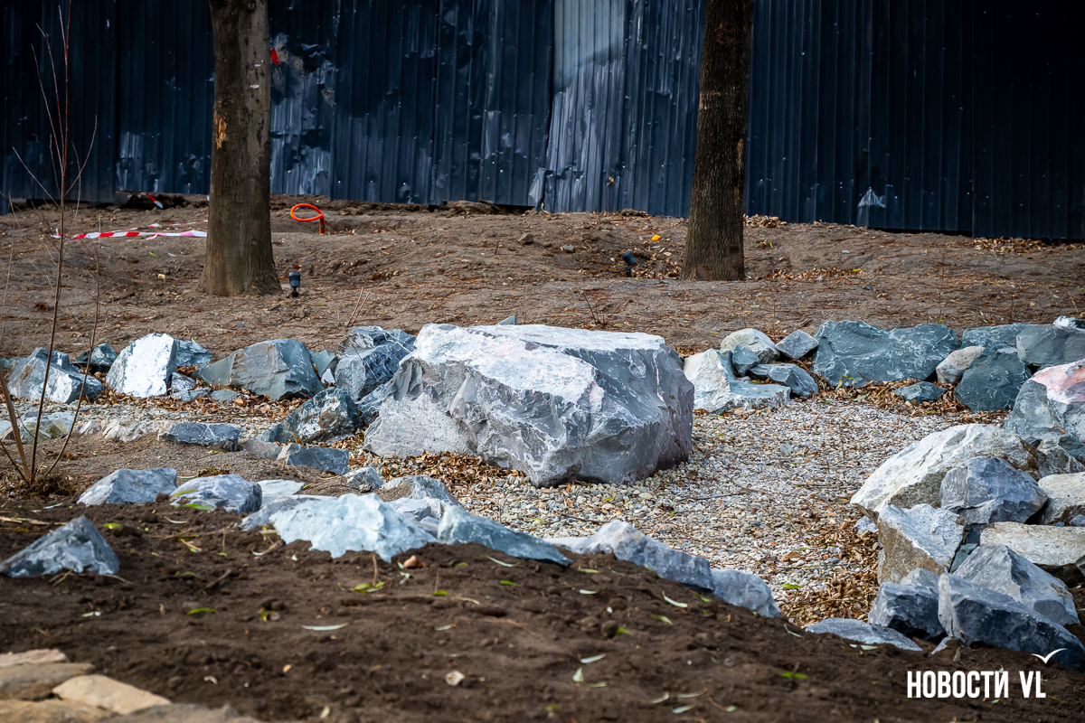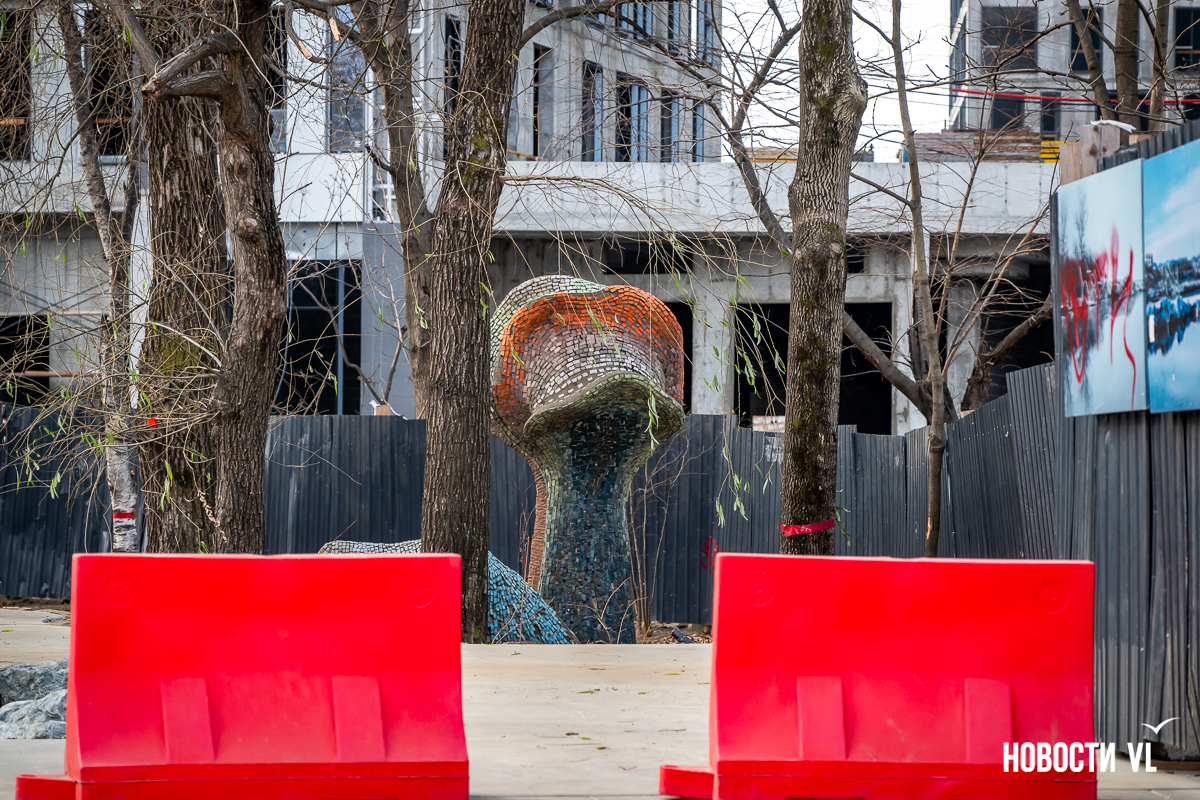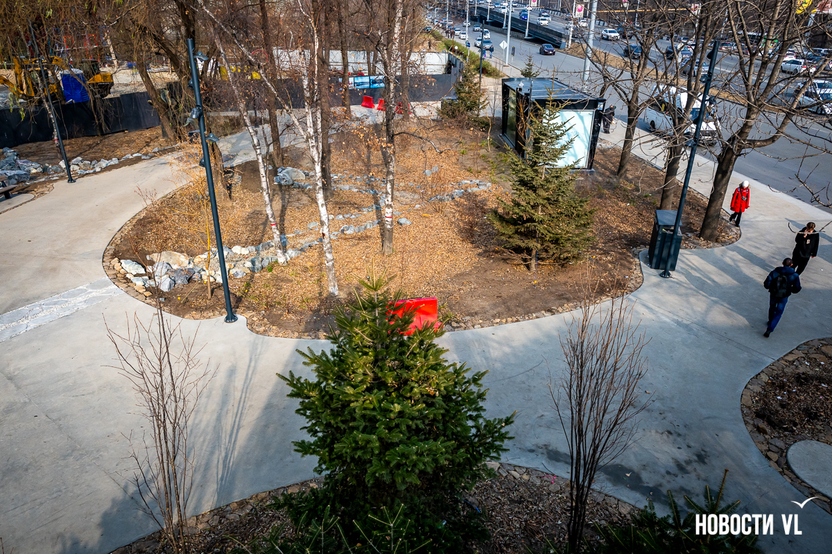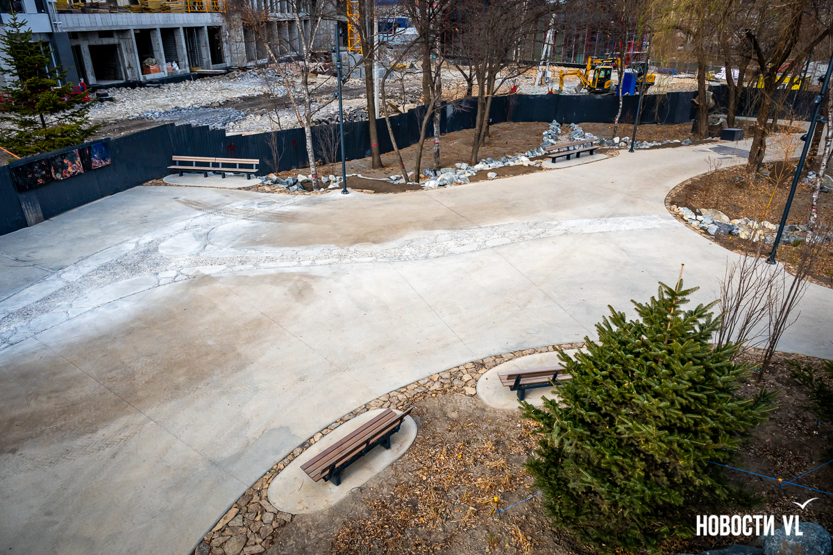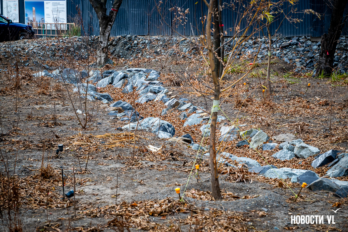 Напомним, сквер между строящимся ЖК Stark и остановкой «Парк Победы» строили с конца мая. Работы велись на территории, которая относится к участку застройщика 25:28:050045:1044 (2,3 га) и неразграниченному городскому участку сразу за ним.