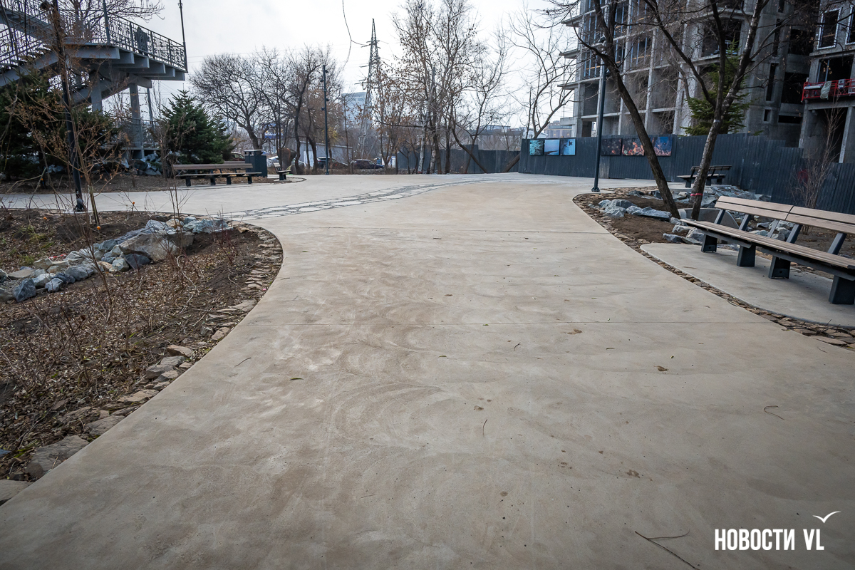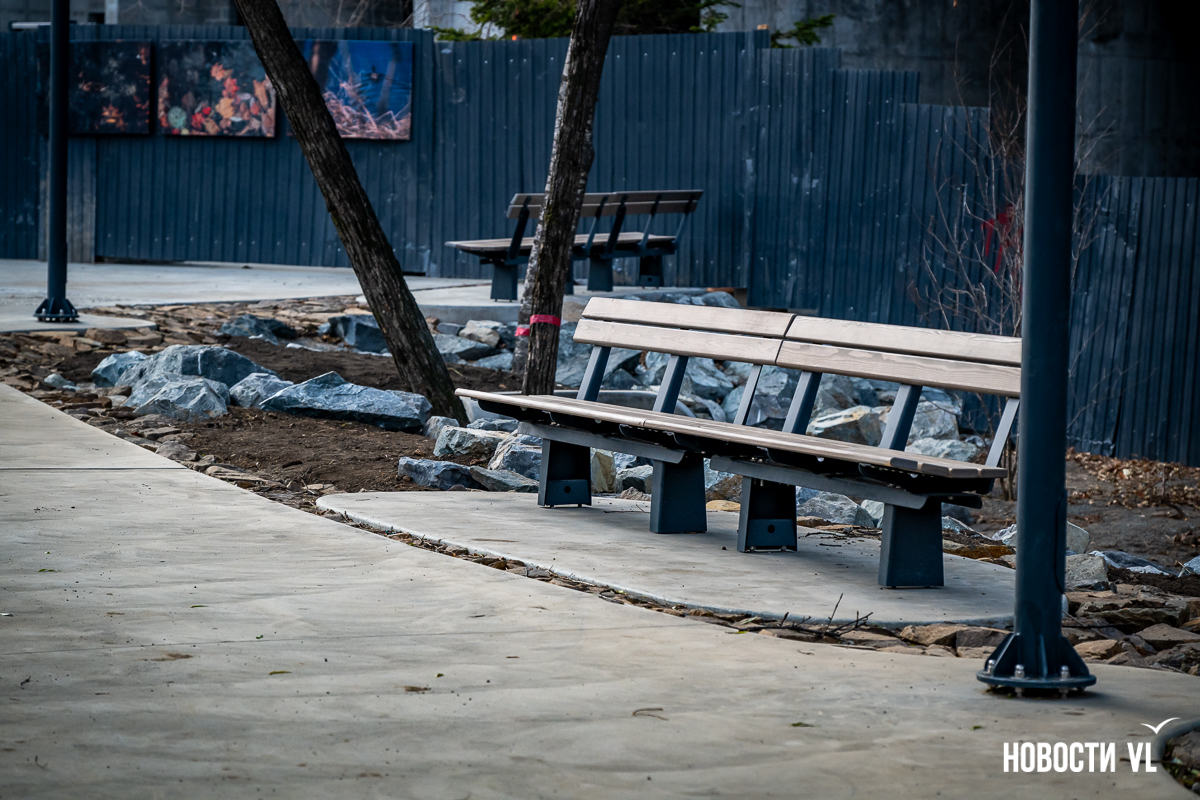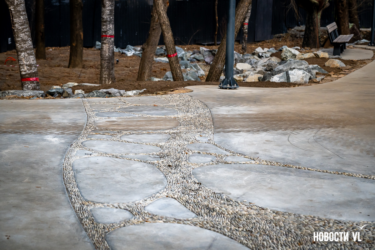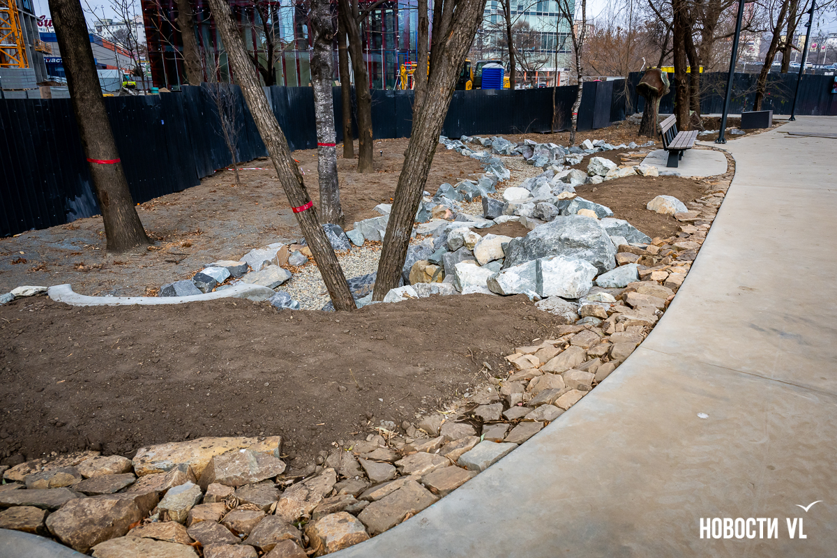 «Мы в своих проектах сейчас пытаемся максимально внедрить флору, свойственную местной природе для того или иного ландшафта. На Спортивной набережной у нас прибрежная местная растительность, которая растёт и именно у нас в Приморье, фактически это попытка воссоздать кусочек природы в городской среде. С этим сквером такой же подход, только здесь приречная флора. Поэтому растений много, и они посажены в большом количестве, чтобы, когда это всё разрастётся, было ощущение нерукотворности. Даже на выкладку камней в русле и на откосах мы обращали внимание. Чтобы это не было похоже на место, созданное человеком, прорабу и рабочим показывали фотографии горных рек», – объясняет архитектор компании Concrete Jungle Рита Шведова.