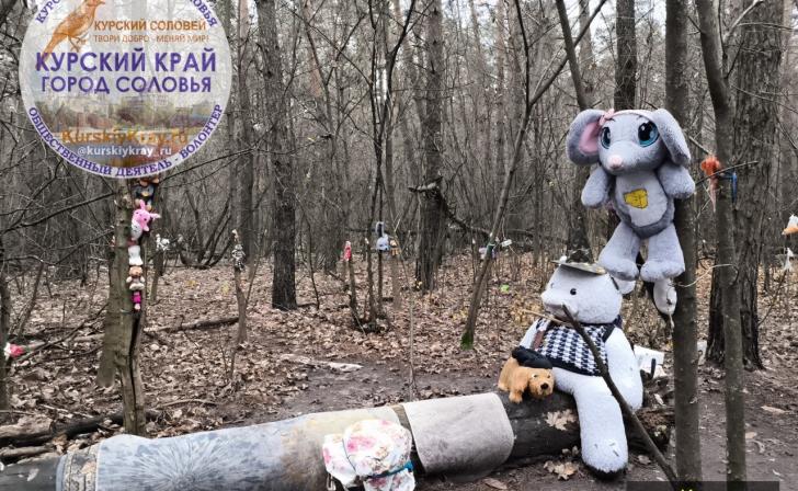 Так, на поляне обнаружили множество мягких игрушек и кукол, хаотично разбросанных и закрепленных на ветвях деревьев и кустарников.