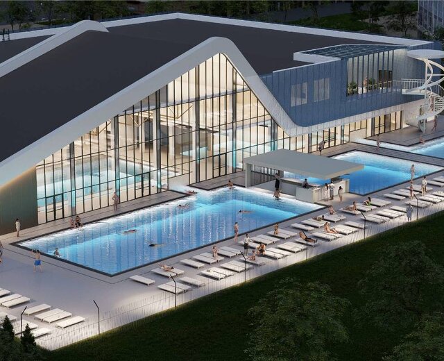 В здании планируют сделать бассейн для занятий водными видами спорта и трибуны для зрителей, бассейны для отдыха взрослых и детей (с неглубоким дном), спортзал, массажные кабинеты и сауны, а также зону с кассами и гардеробами, кафе, офисы и другие вспомогательные помещения.