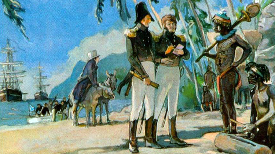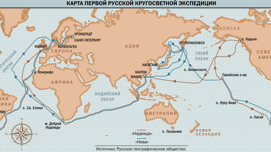 Первое русское кругосветное плавание продолжалось три года. За это время экспедиция побывала у мыса Горн, Островов Зеленого Мыса, на Канарах и Гавайях, в Бразилии, Чили, Китае, Японии, Макао, на Камчатке и Сахалине. В пути их ждало немало опасностей и препятствий, которые моряки, впрочем, удачно преодолевали.