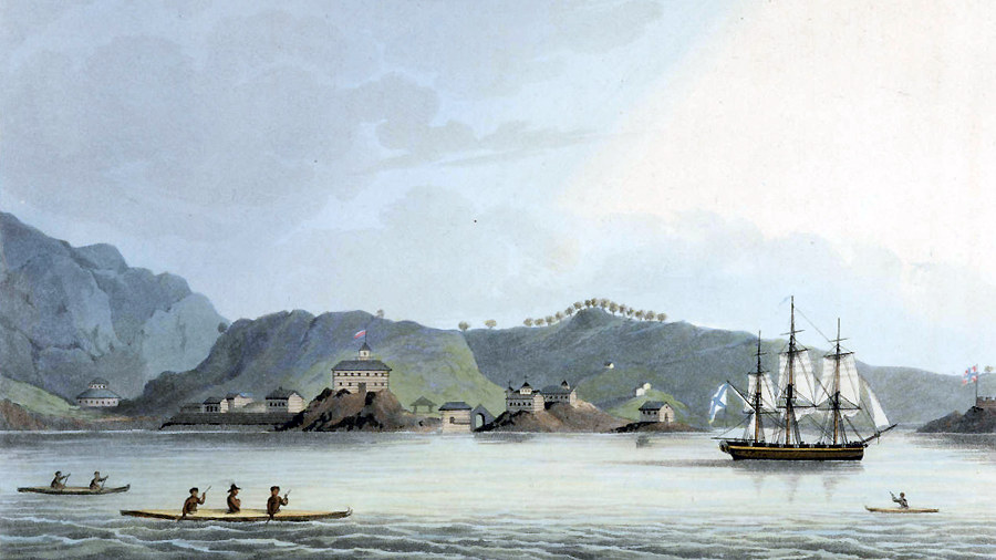 Шлюп «Нева» в гавани святого Павла на острове Кадьяк (Русская Америка). Гравюра по рисунку Юрия Лисянского. 1804