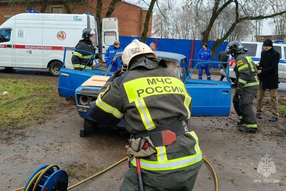 Согласно легенде учений, автомобиль потерял управление, вылетел на обочину и врезался в препятствие. В аварии пострадали водитель и пассажир, которые оказались заблокированы в машине.
