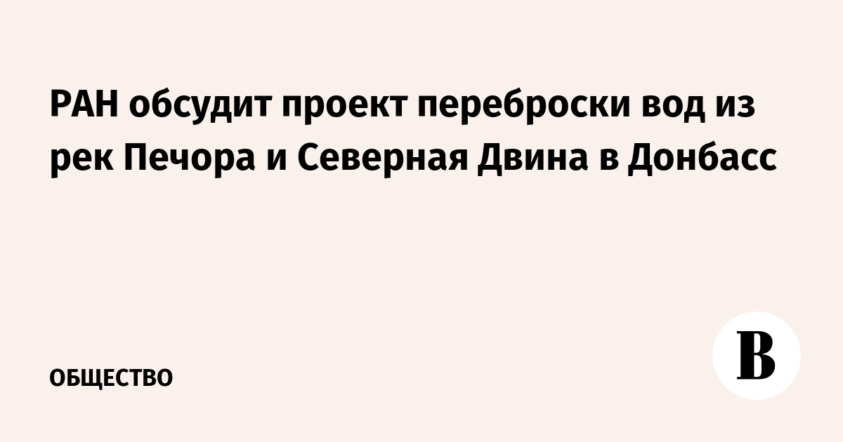 Тему строительства трубопровода, через который появится возможность перебросить воду из рек Печора и Северная Двина в Донбасс, обсудят на заседании отделения наук о Земле Российской академии наук (РАН). Об этом ТАСС сообщил научный руководитель Института водных проблем РАН Виктор Данилов-Данильян.