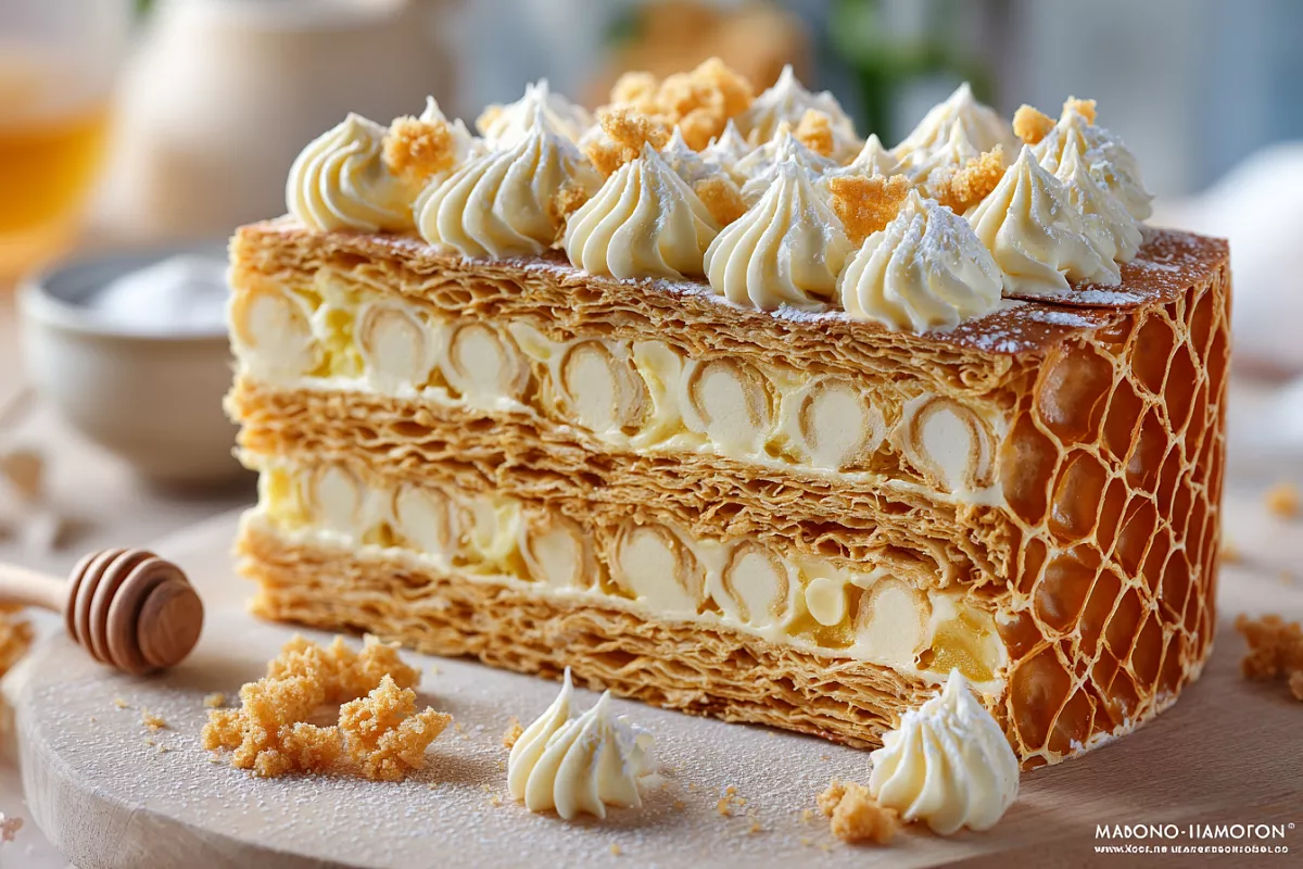 Лёгкие ажурные коржи из заварного теста и шёлковый заварной крем создают потрясающий разрез, похожий на пчелиные соты.