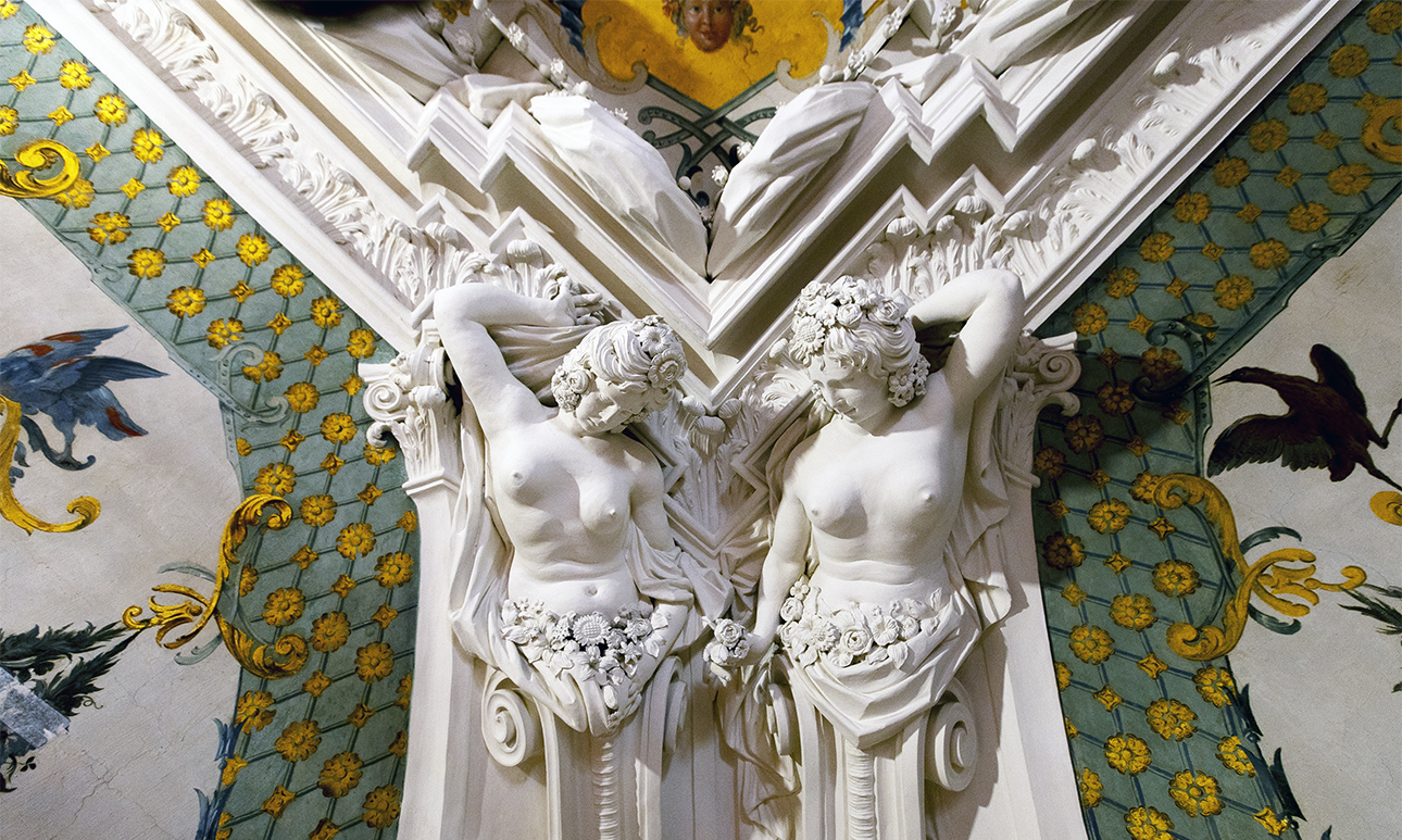 Первый этап работ в интерьерах дворца включает в себя реставрацию живописи в галереях и центральном парадном зале, работу с лепниной и дубовой облицовкой стен. «По живописи выполнены работы по укреплению красочного слоя, грунта, штукатурного основания, выполнен большой объем по инъектированию укрепляющих составов в трещины стен, — говорит Михаил Ботаковский, директор ООО «Петербургская реставрационная компания». — Аналогичные работы выполнены по позолоте — укрепление позолоты, грунта, основания».