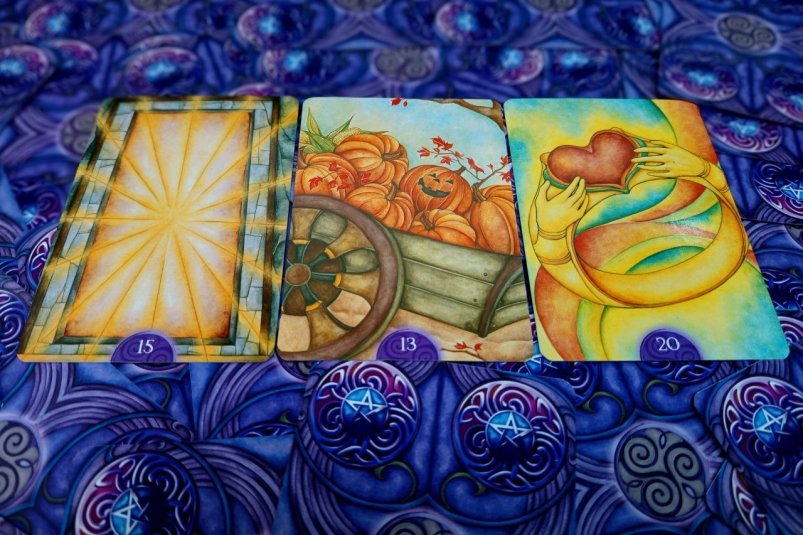 Карта Самайн — одноимённый кельтский праздник, знаменующий начало Нового года и открытие завесы между мирами. В контексте пророчества эта карта указывает на время подведения итогов, ритуального "сжигания" старого и встречи с собственной Тенью — не в негативном смысле, а как с частью себя, которую давно пора принять.