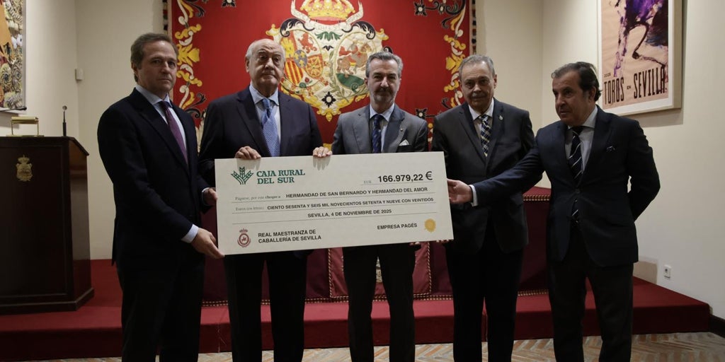 El acto de entrega ha tenido lugar en el Salón de Carteles del coso del Baratillo y ha contado con la presencia del teniente de Hermano Mayor de la Real Corporación, Marcelo Maestre León; Ramón Valencia Pastor, en representación de la Empresa Pagés; así como los hermanos mayores de las corporaciones beneficiarias, José García Rodríguez, de la hermandad de San Bernardo, Juan Cruzado Candau, de la hermandad del Amor y Manuel Vázquez Gago como coordinador del festival.