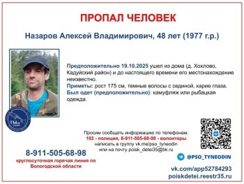 Житель деревни Хохлово 48-летний Алексей Назаров ушел из дома еще в середине прошлого месяца – предположительно, 19 октября – и до настоящего времени его местонахождение неизвестно.