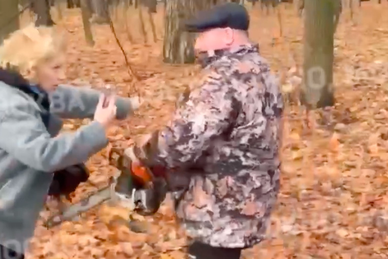 На них женщина, снимающаяся рабочего с уже заведенной бензопилой на телефон, пытается не подпустить его к деревьям.