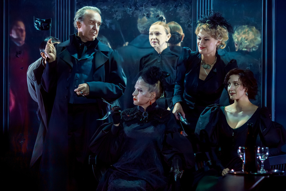 Для артистов «Покровка.Театр» это первая совместная работа с новым худруком. Материал выбрали, «следуя заветам основателя театра» Сергея Арцибашева, который замыслил театр как классический, куда можно привести школьников и показать им шедевры мировой и отечественной драматургии, хотя и не без современных решений. Например, настенные зеркала — цифровые экраны, ставшие частью декораций, — дополненная реальность, на которой то детали интерьера старинной усадьбы, то гроза, то привидения. Cценографическое решение к тому же визуально расширяет камерное, интимное пространство крохотного зала.