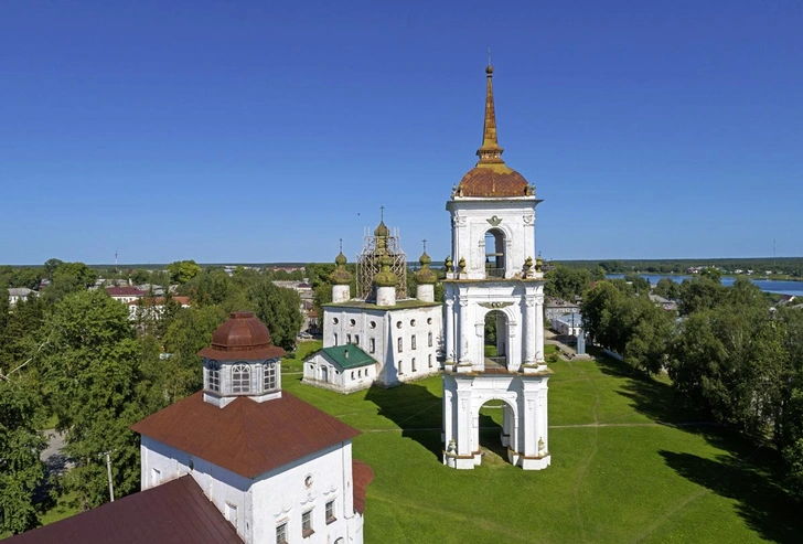 С высоты Каргополь предстает во всей своей красе: прямоугольная сетка улиц — наследие екатерининского градостроительства, белокаменные храмы XVI–XVIII веков, деревянные дома с мезонинами и резными карнизами и река Онега, спокойно несущая свои воды к Белому морю. Мы слышим колокол.
