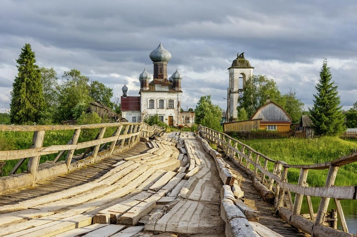 Один из них — церковь Михаила Архангела. Она словно иллюстрация к учебнику по деревянному зодчеству. Этот уникальный однопрестольный деревянный храм последний сохранившийся на верхней Онеге образец кубоватой архитектуры. Так называют строение с квадратным в плане покрытием, имеющее одинаковый силуэт со всех сторон.