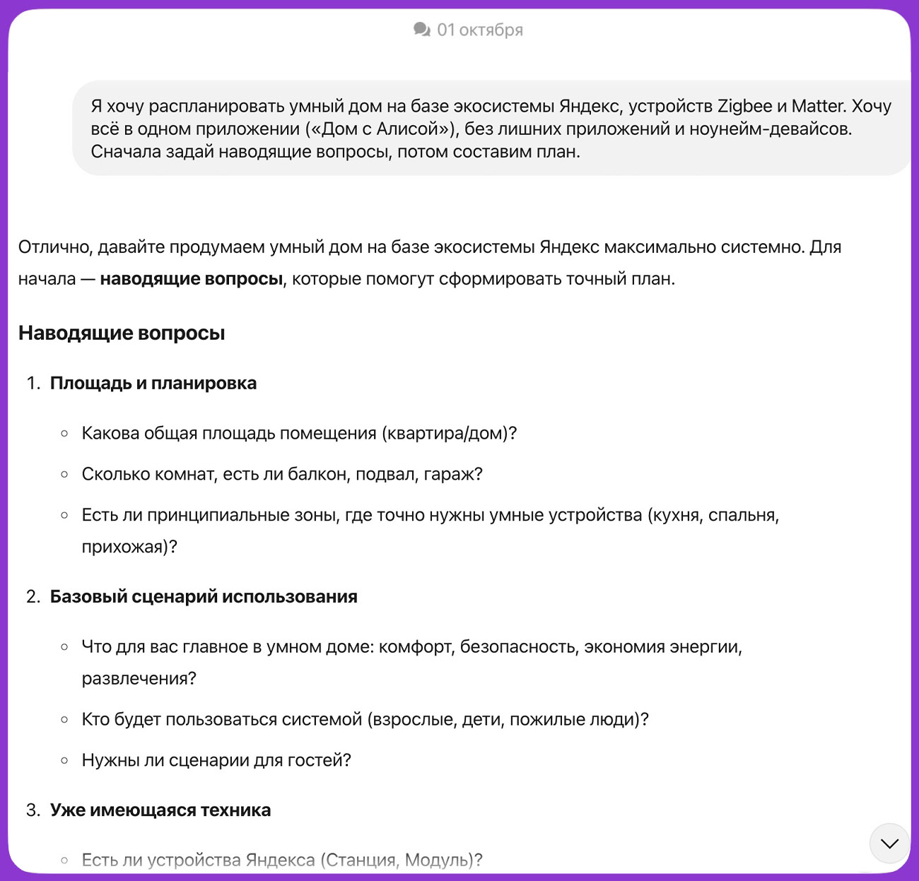 📍Промпт: Я хочу распланировать умный дом на базе экосистемы Яндекс, устройств Zigbee и Matter. Хочу всё в одном приложении («Дом с Алисой»), без лишних приложений и ноунейм-девайсов. Сначала задай наводящие вопросы, потом составим план.