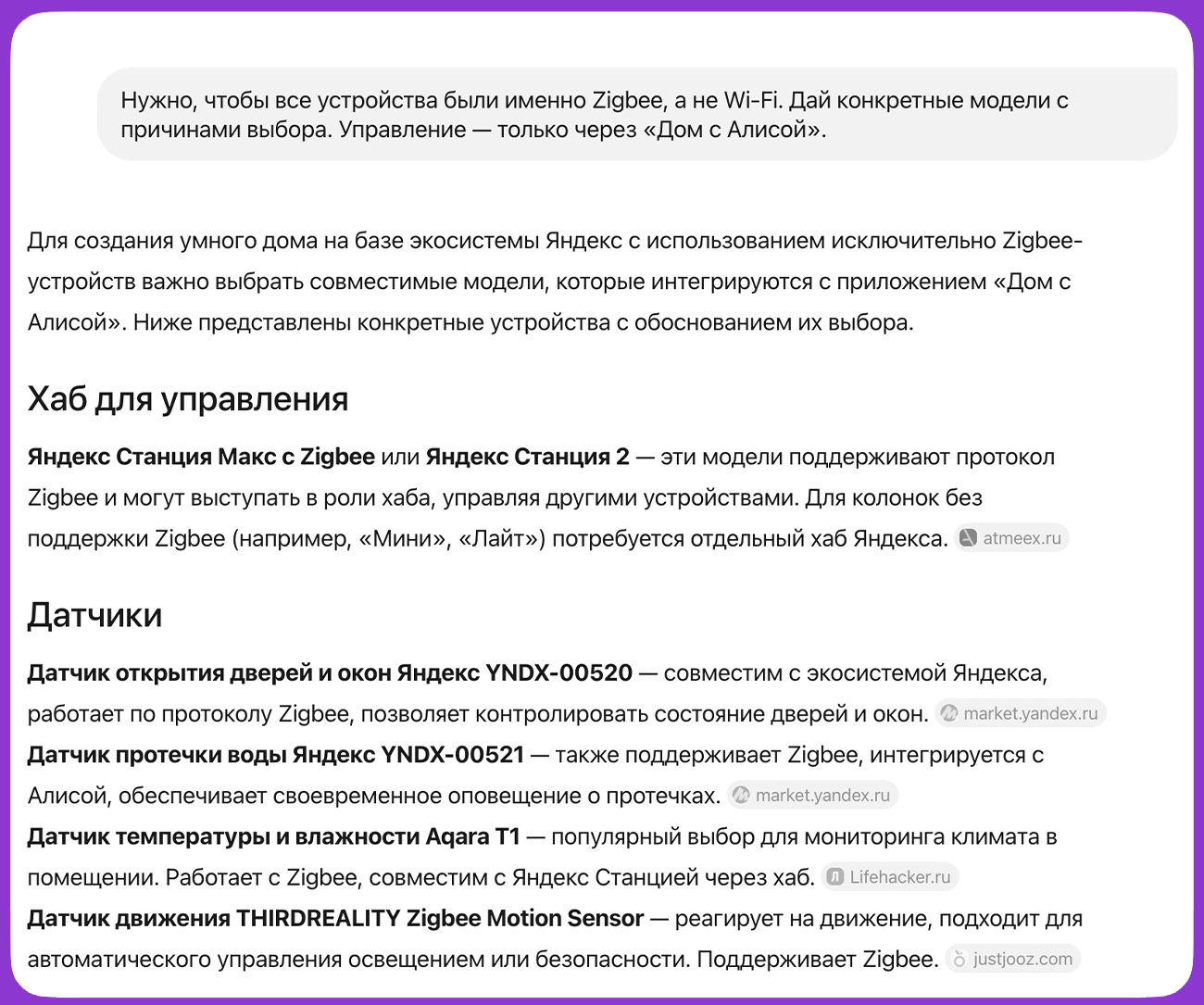 📍Промпт: Нужно, чтобы все устройства были именно Zigbee, а не Wi-Fi. Дай конкретные модели с причинами выбора. Управление — только через «Дом с Алисой».