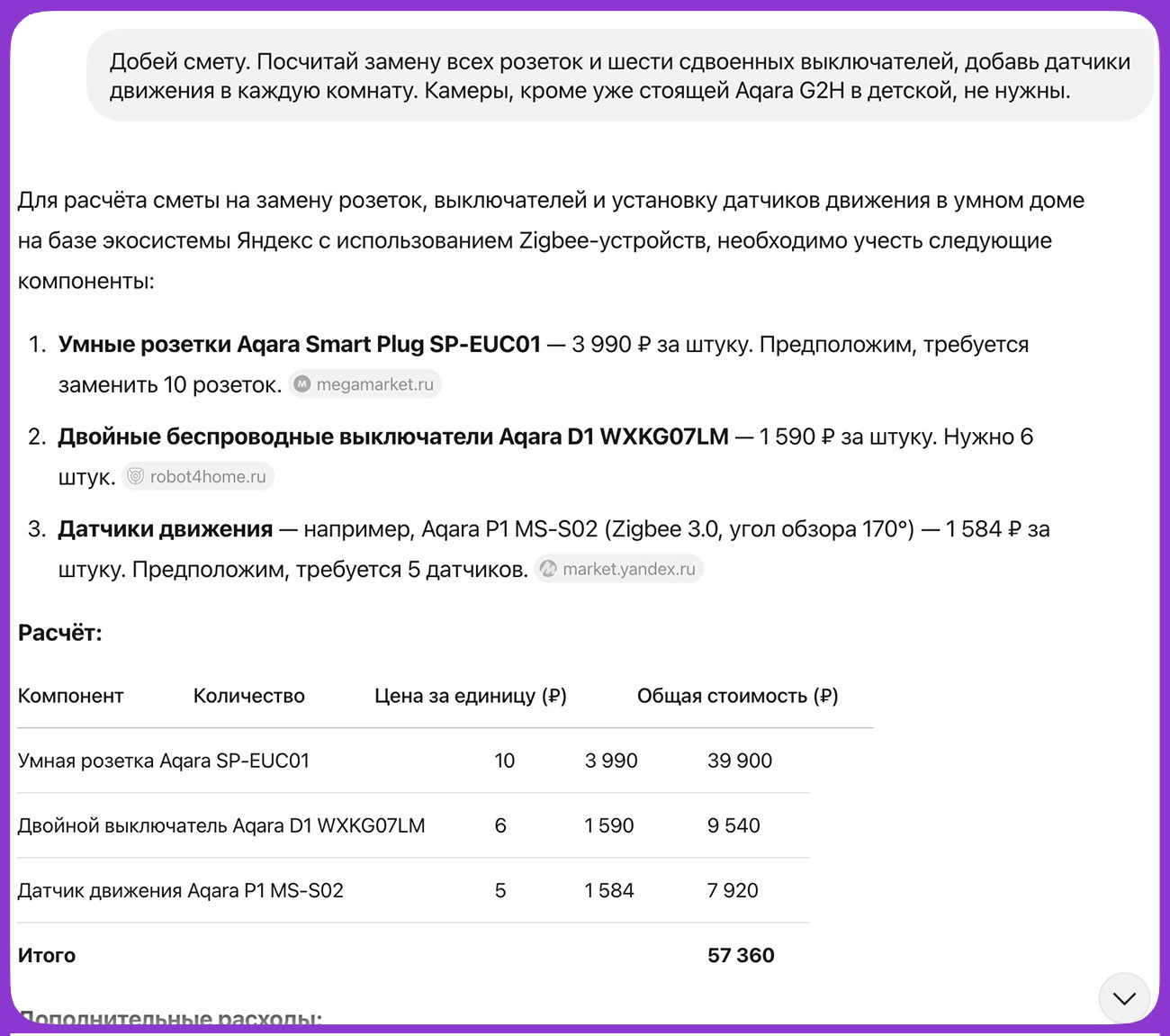 📍Промпт: Добей смету. Посчитай замену всех розеток и шести сдвоенных выключателей, добавь датчики движения в каждую комнату. Камеры, кроме уже стоящей Aqara G2H в детской, не нужны.
